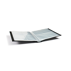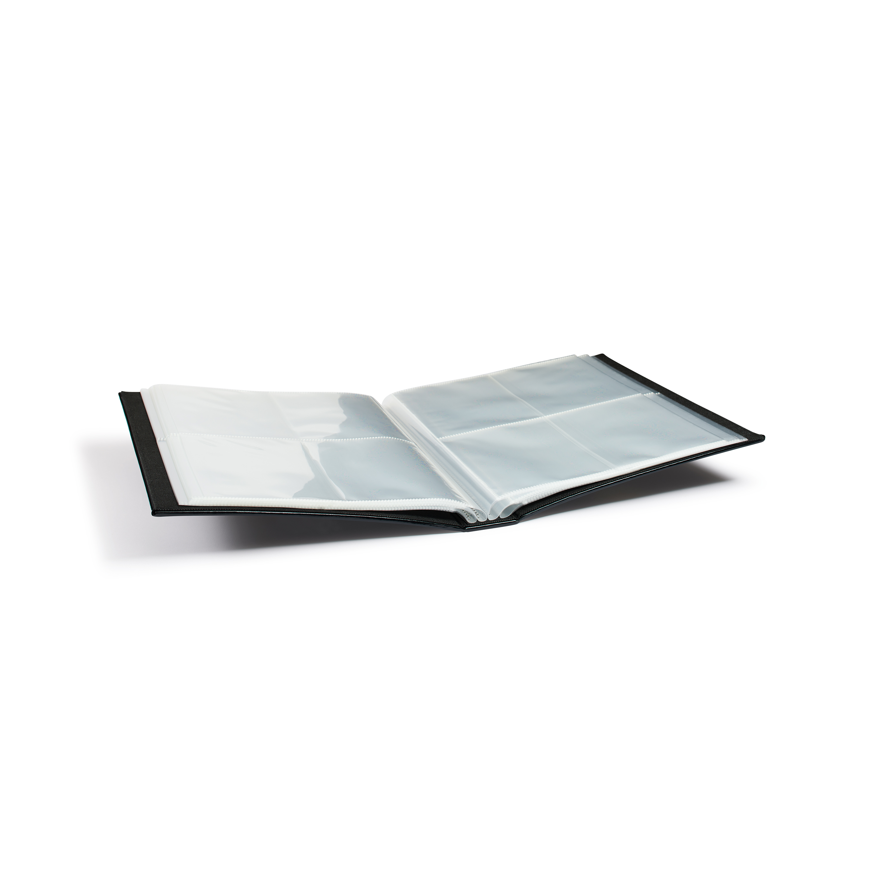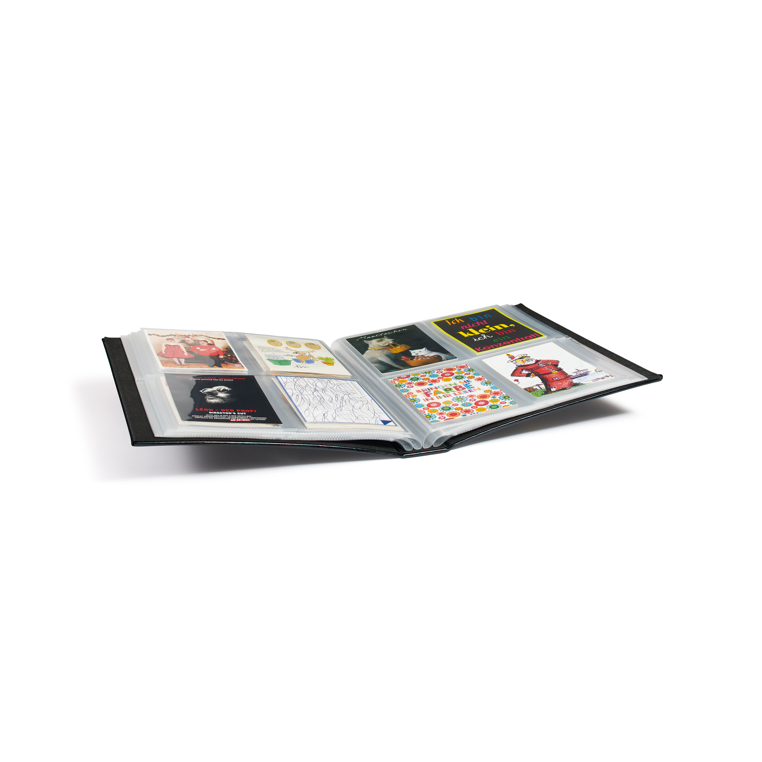 High-quality postcard album with 50 integrated clear sheets for holding 400 postcards up to 162 x 114 mm (6 1/3 x 4 1/2’’) in size. Each sheet holds up to 8 postcards (if both sides of the sheet are used). High-quality finish featuring seamed binding and an elegant leatherette cover. Colour: black. Overall size: 290 x 350 x 58 mm (11 1/2 x 13 3/4 x 2 1/3’’).