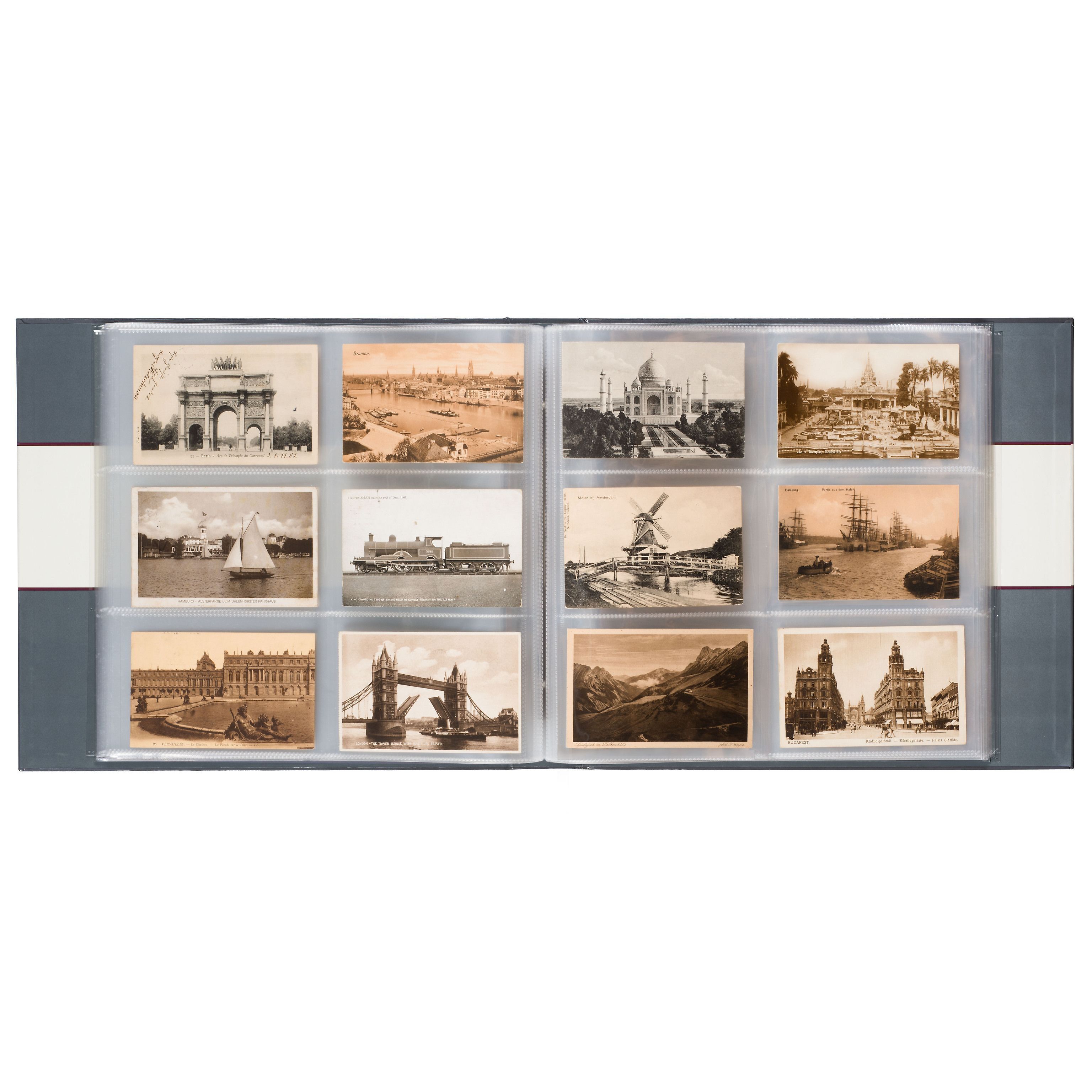 Nostalgic album for holding 600 historical postcards up to size 145 x 95 mm (5 3/4 x 3 3/4"). With 50 permanently bound sheets for holding 12 postcards each (when storing two cards per pocket). Each sheet offers secure holding and protection against impurities. Sheet made of transparent, softener-free plastic for two-sided viewing of the cards. The cover illustrates various historical postcards of meaningful landmarks from around the world. Overall size: 375 x 343 x 55 mm (14 3/4 x 13 1/2 x 2 1/8").