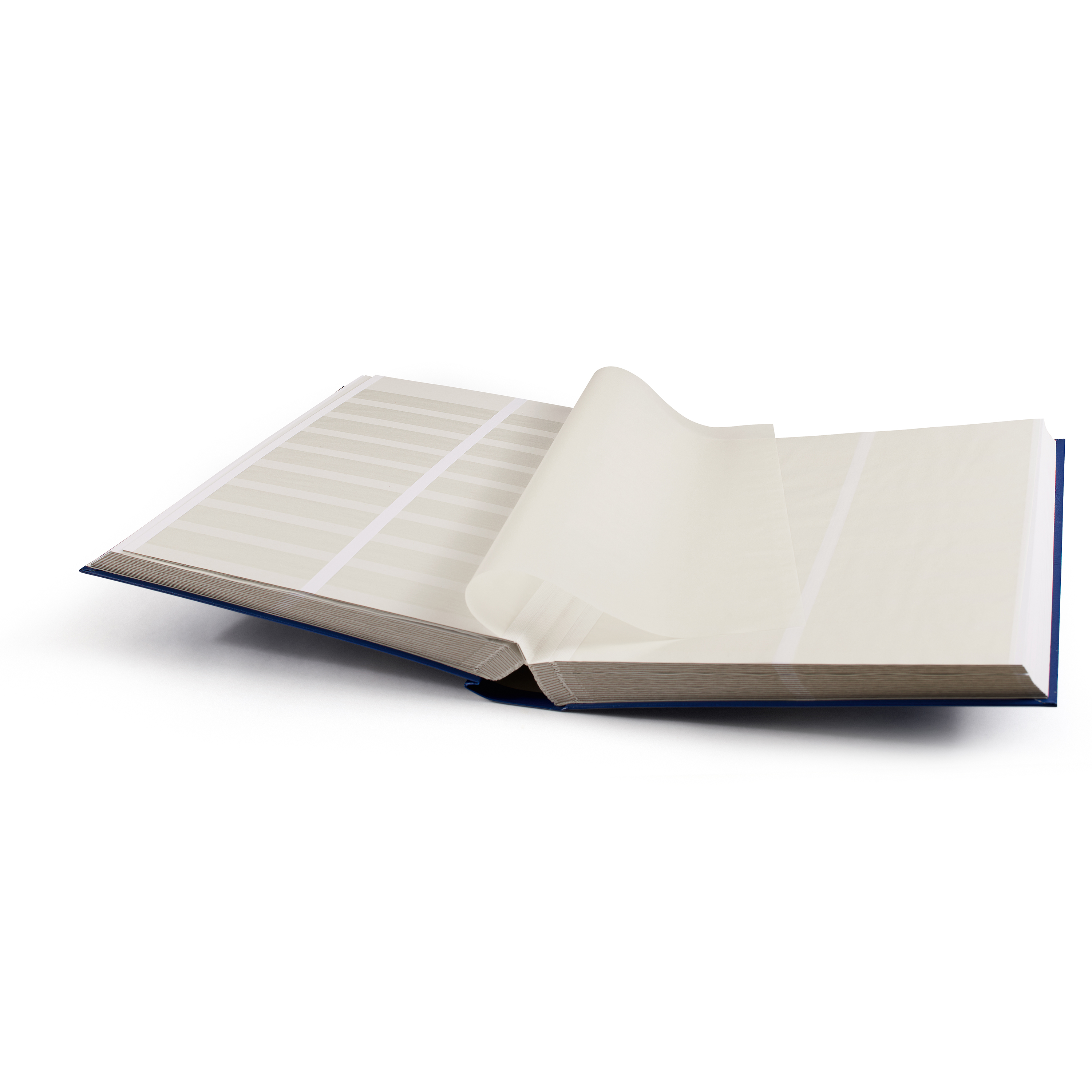 BASIC stockbook A4* with 64 white pages and un-padded cover. Interleaving with 9 glassine strips per page and double hinge binding. Available in 4 colours.