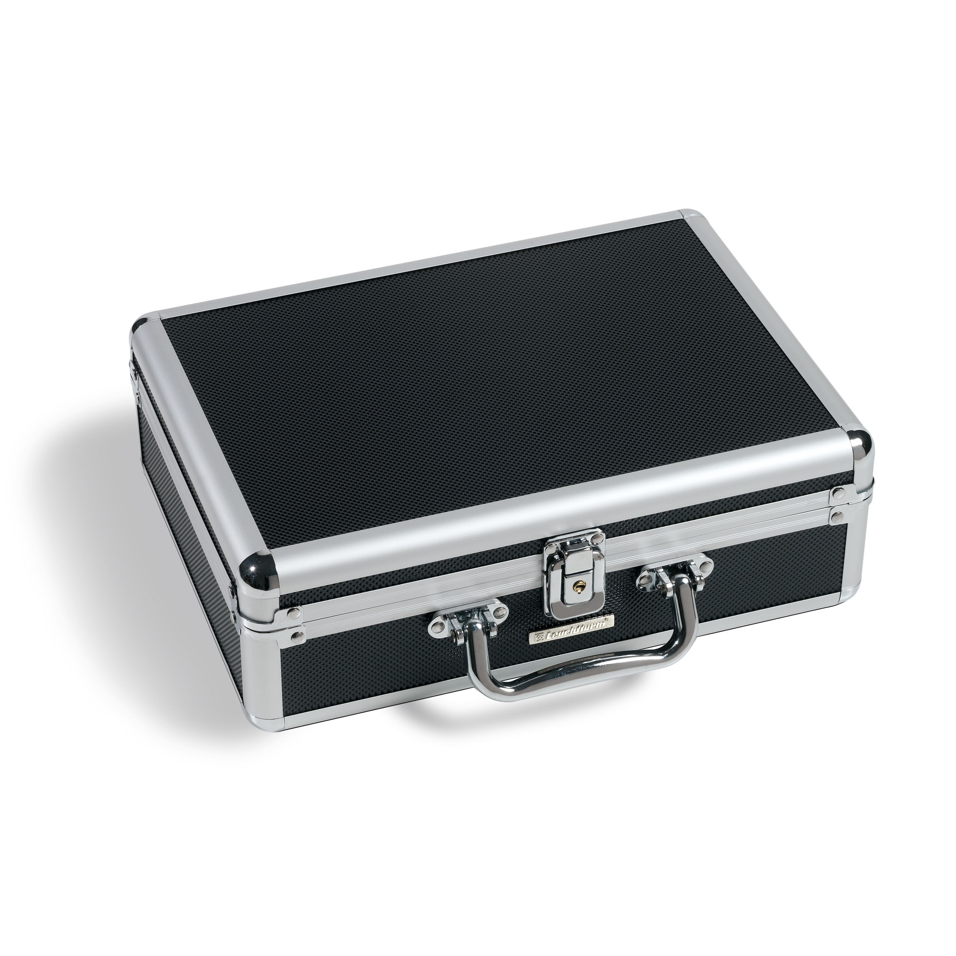 Small coin case CARGO S6. Padded case lid, lines inside with black velour. Lockable (2 keys). Metal fittings. Overall size (W/L/H) 292 x 213 x 97 mm.