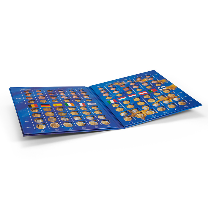 In the coin album PRESSO EURO-COLLECTION 1 there are eight placeholders for the coins of one cent, two cents and five cents (reddish colored, steel with copper coating), ten, twenty and fifty cents (yellowish colored, Nordic gold) as well as one and two euros (bimetal) provided. Big Euro countries like Germany, France or Spain find their place in the album as well as Euro rarities from Finland or Luxembourg.