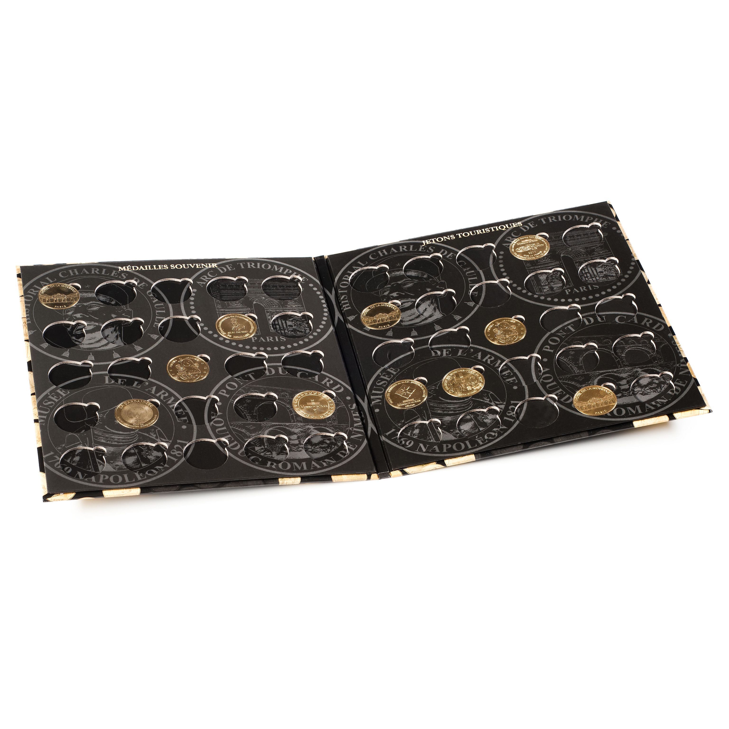 Coin album made of colour-printed, strong card with cut-outs which are perfectly shaped to hold 50 French “Médailles Souvenirs” ("Souvenir Medals") Diameter of 34 mm. Overall size: 255 x 280 mm