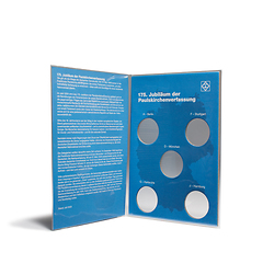 Collectors’ card made from strong card featuring cut-outs for accommodating 5 German „175. Jubiläum der Paulskirchenverfassung“ 2-euro commemorative coins for 2019 (minting letters A, D, F, G, J). Housed in a transparent plastic film, free from chemical softener. The coins are visible from both sides. Features interesting background information and artwork. Overall size: 106 x 144 mm (4 ¼ x 5 ?"). Perfect for gift wrapping.
