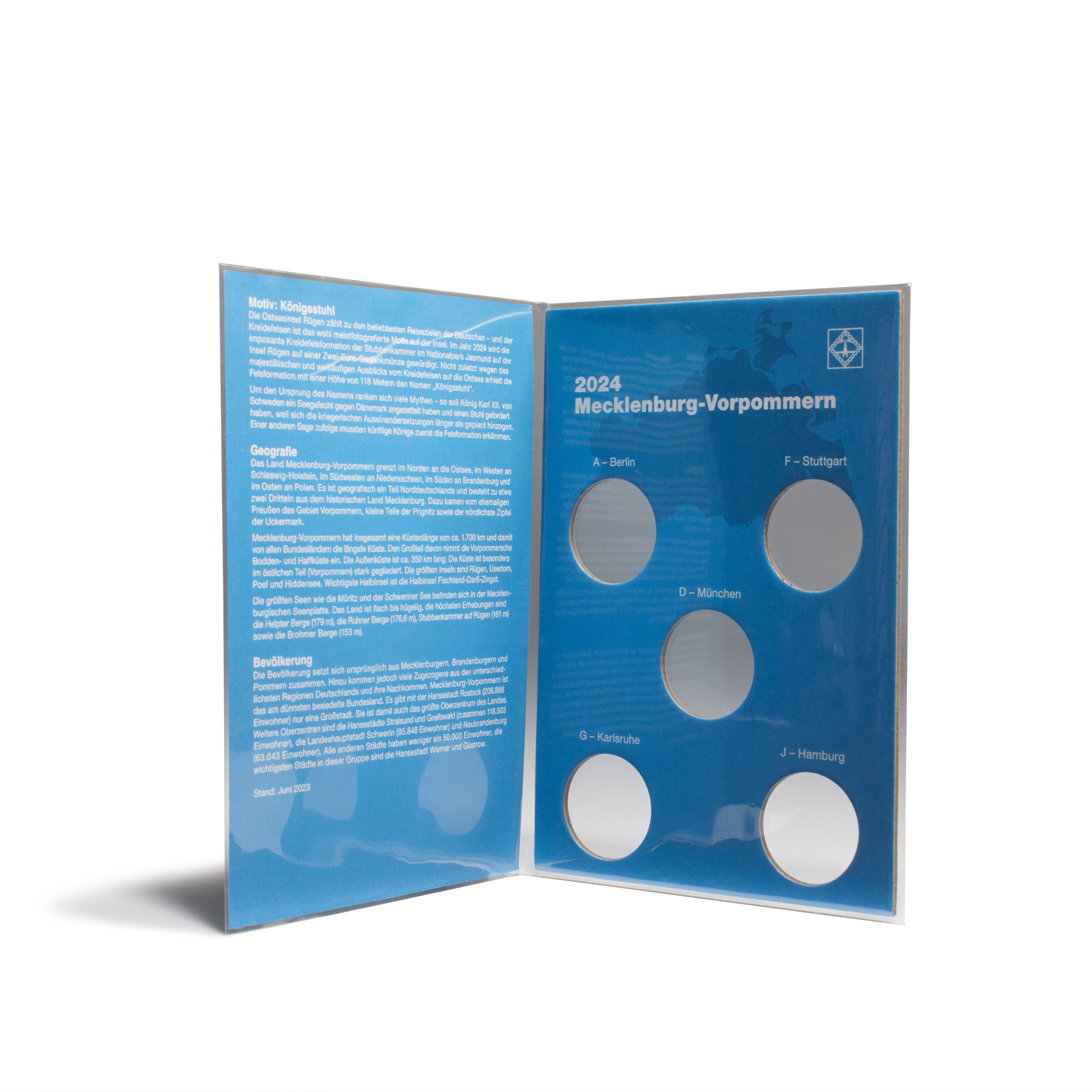 Collectors’ card made from strong card featuring cut-outs for accommodating 5 German „Mecklenburg-Vorpommern“ 2-euro commemorative coins for 2024 (minting letters A, D, F, G, J). Housed in a transparent plastic film, free from chemical softener. The coins are visible from both sides. Features interesting background information and artwork. Overall size: 106 x 144 mm (4 ¼ x 5 ?"). Perfect for gift wrapping.