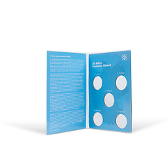 cut-outs for accommodating 5 German "35 Jahre deutsche Einheit" 2 euro commemorative coins for 2025 (minting letters A, D, F, G, J). Housed in a transparent plastic film, free from chemical softener. The coins are visible from both sides. Features interesting background information and artwork. Overall size: 106 x 144 mm (4 ¼ x 5 ").