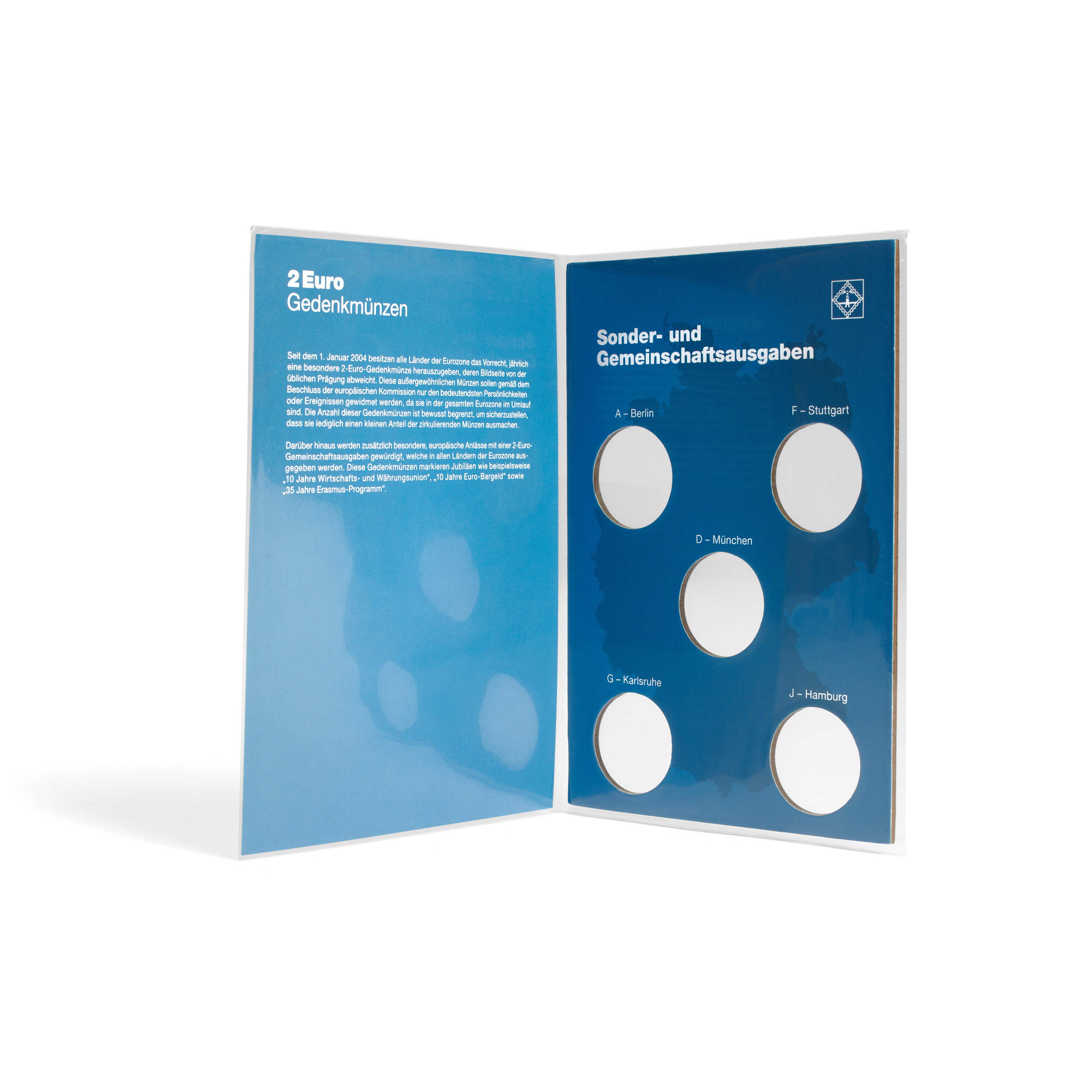 Collectors' card made from strong card featuring cut-outs for accommodating 5 German 2 euro commemorative coins in neutral edition, individually applicable. Housed in a transparent plastic film, free from chemical softener. The coins are visible from both sides. With label option on the cover.