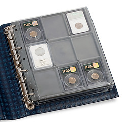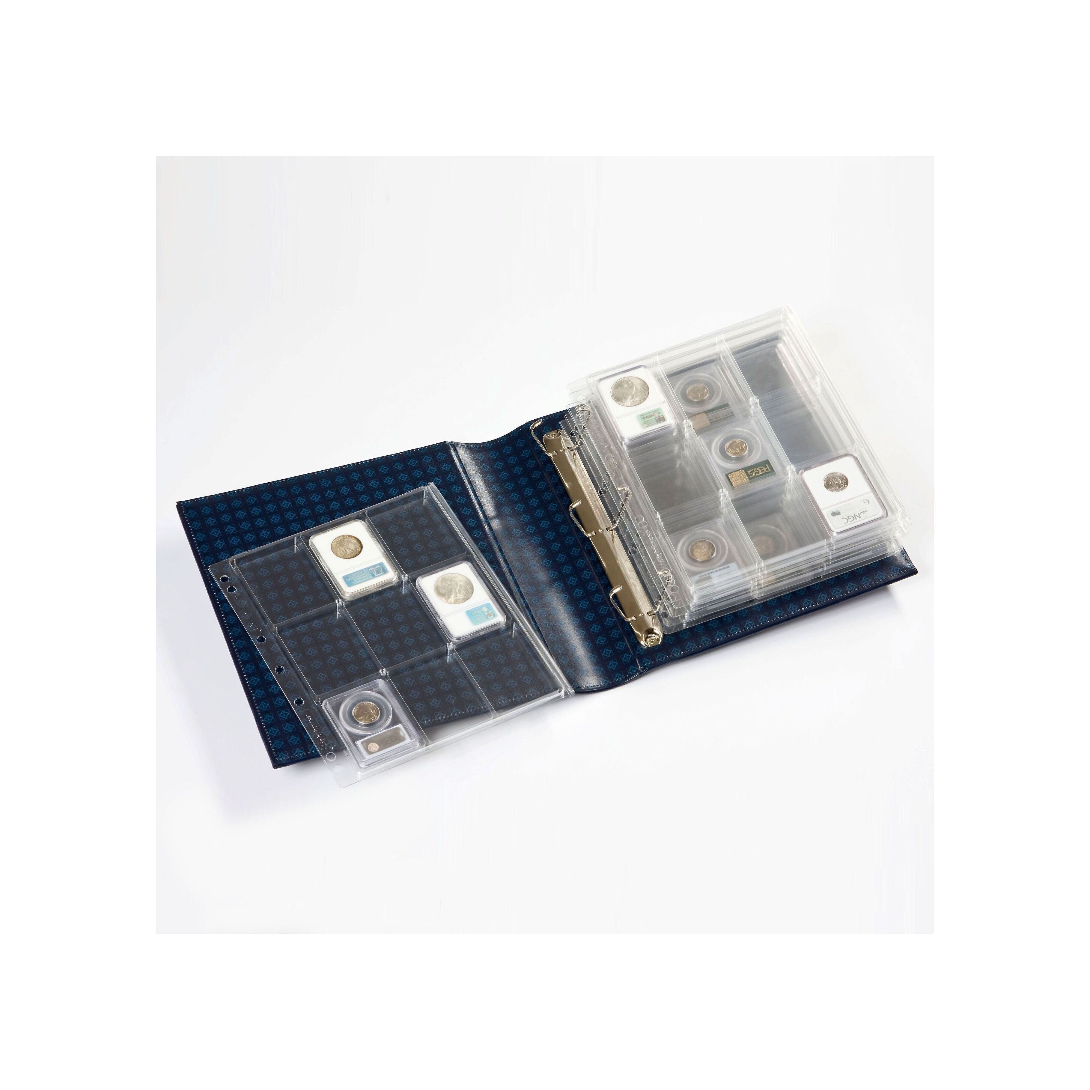 Panel made of high-quality, very solid clear synthetic material to store US coin capsules (PCGS/NGC). Overall size: 240 x 282 mm.