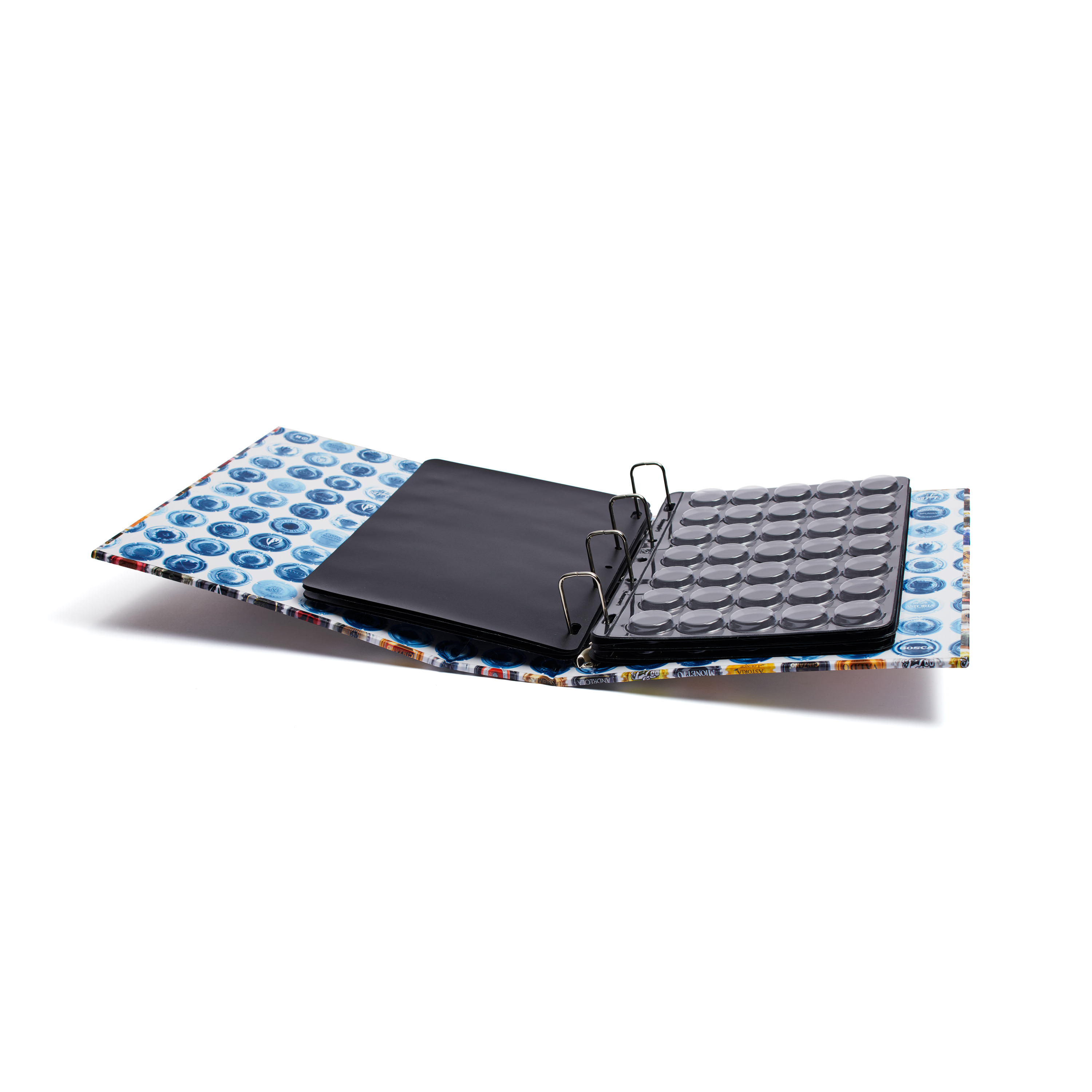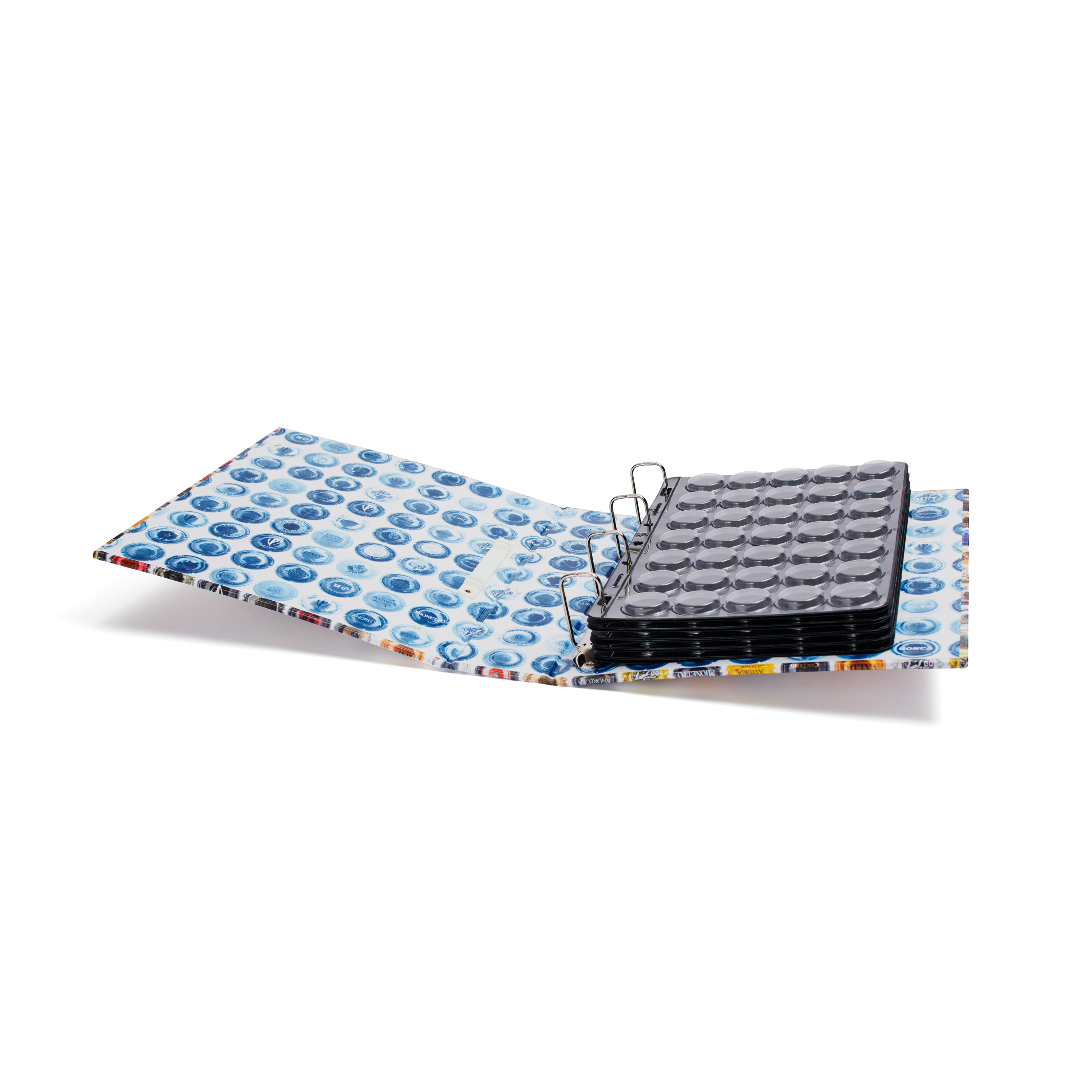 This album for sparkling wine caps is ideal for keeping collections safe and organised. It contains five black Compart 42 sheets, each offering space for 42 caps, as well as five interleaf pages to clearly separate the sheets. The caps are carefully inserted from behind into the recesses provided. The robust 4-ring mechanism enables easy handling and can be extended to up to nine sheets (378 caps) if required. With generous external dimensions of 280 x 325 x 77mm, the album offers enough space to optimally organise your collection.