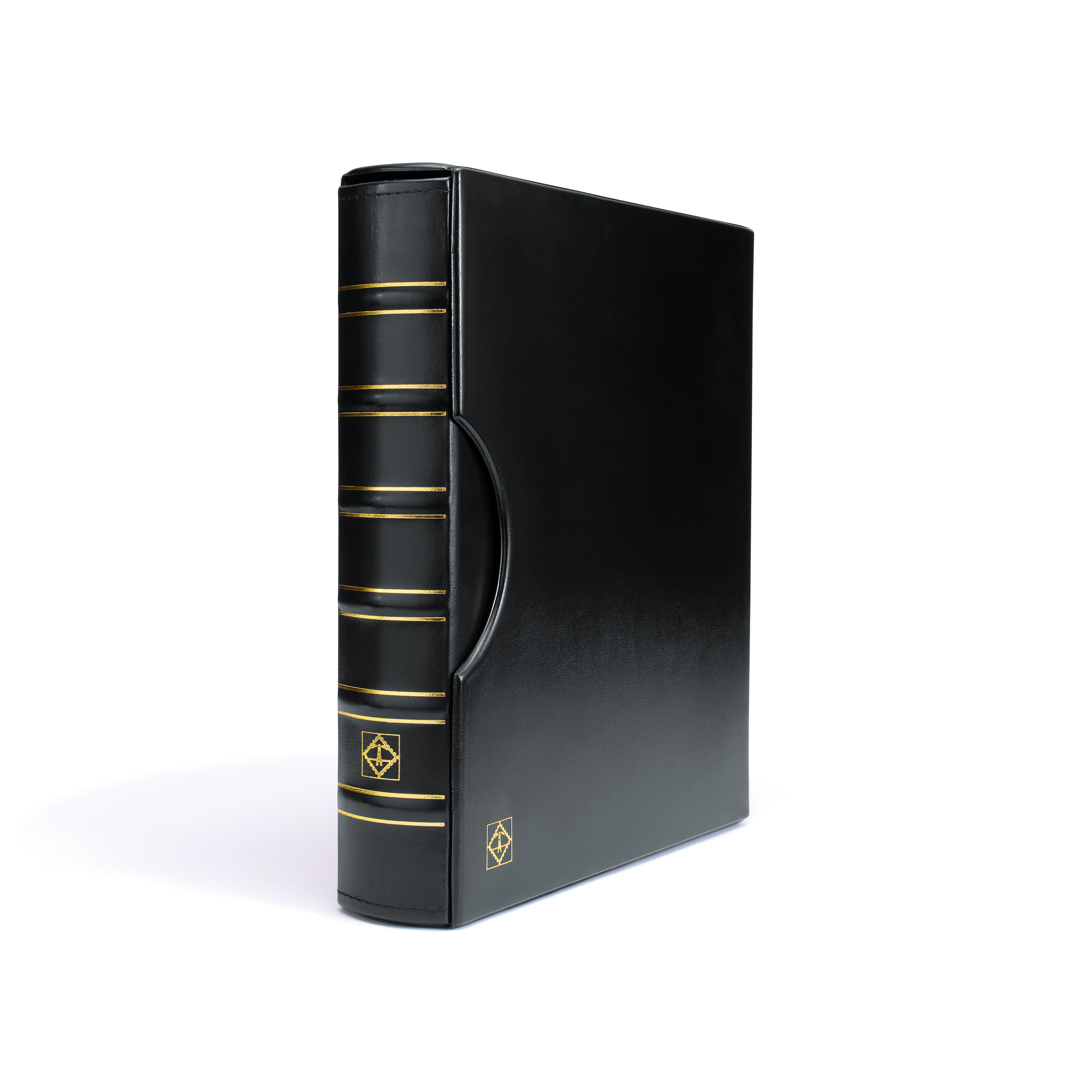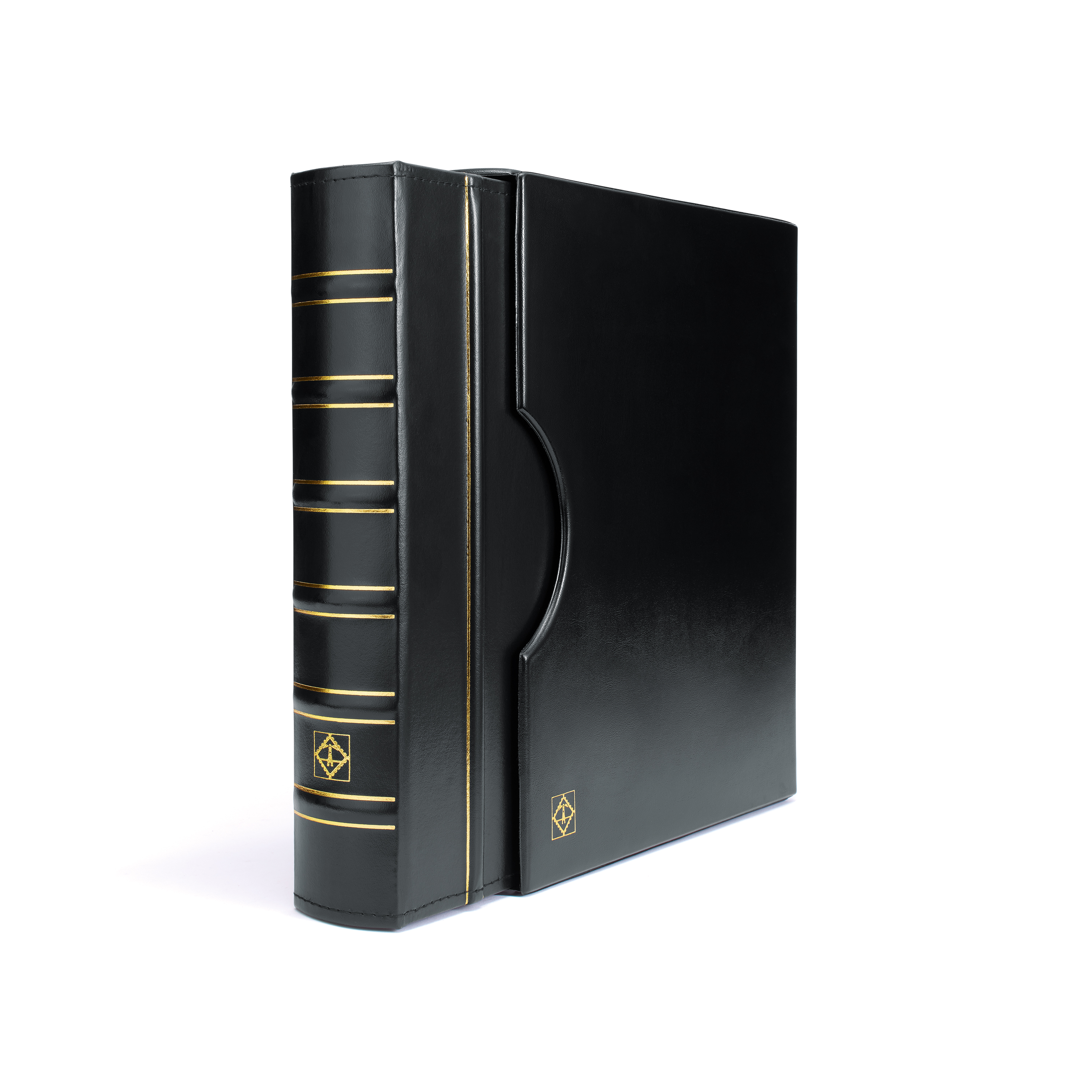 GRANDE ring binder with slipcase in classic design and 4-D ring mechanism. Richly embossed spine and front. Size of binder: 290 325mm, size of slipcase: 293 x 335 x 70 mm.