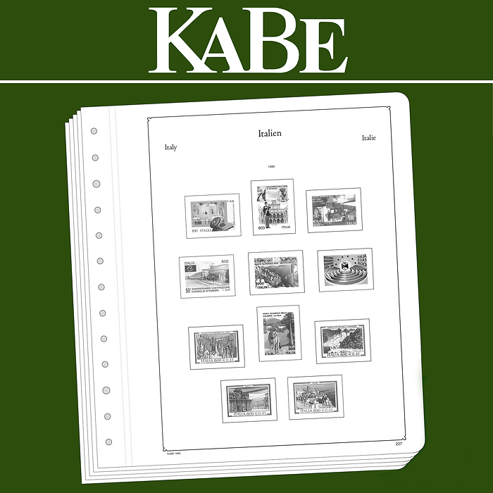 KABE illustrated pages (size 275 x 310 mm) are printed on non-ageing wood and acid-free card (175 g/m 2 ) in high-resolution black and white offset print. Colour printing is consciously avoided. This allows you to immediately spot the missing stamps in your collection.