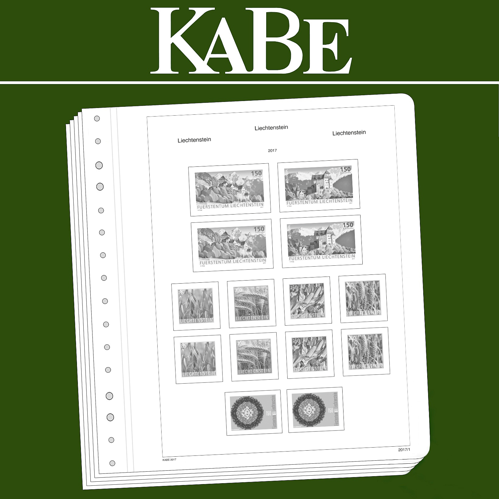 KABE illustrated pages (size 275 x 310 mm) are printed on non-ageing wood and acid-free card (175 g/m 2 ) in high-resolution black and white offset print. Colour printing is consciously avoided. This allows you to immediately spot the missing stamps in your collection.