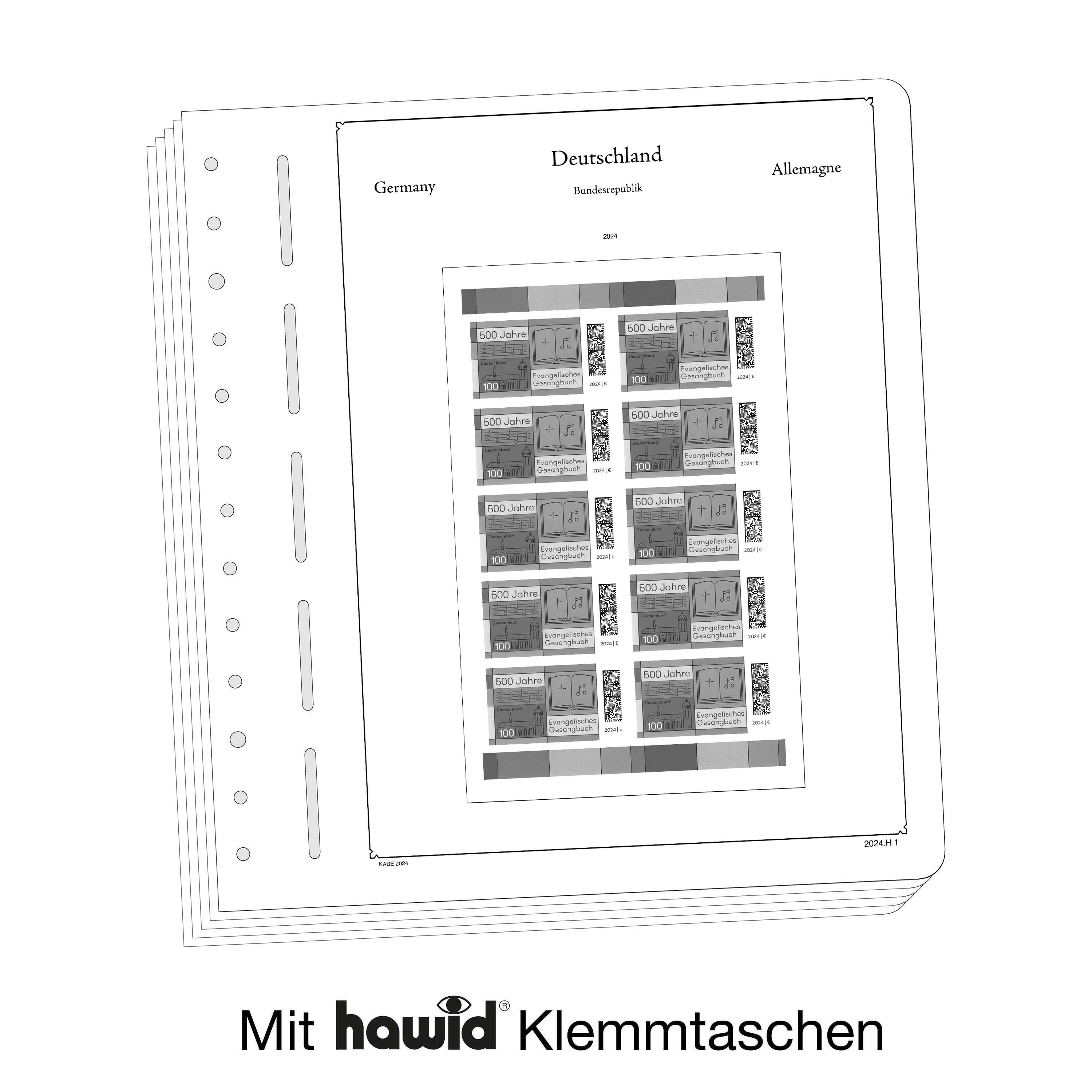KABE illustrated pages (size 275 x 310 mm) are printed on non-ageing wood and acid-free card (175 g/m 2 ) in high-resolution black and white offset print. Colour printing is consciously avoided. This allows you to immediately spot the missing stamps in your collection.
