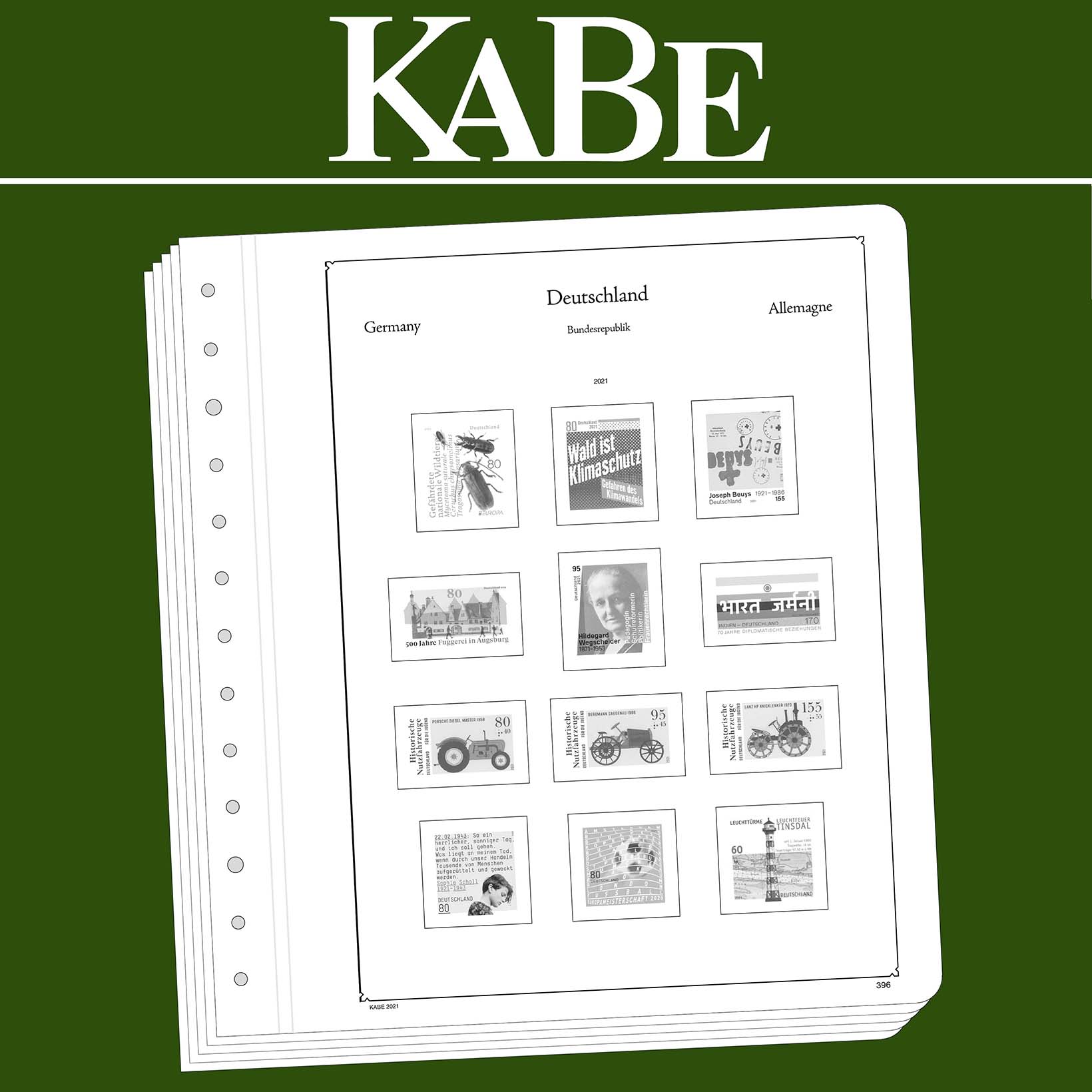 KABE illustrated pages (size 275 x 310 mm) are printed on non-ageing wood and acid-free card (175 g/m 2 ) in high-resolution black and white offset print. Colour printing is consciously avoided. This allows you to immediately spot the missing stamps in your collection.