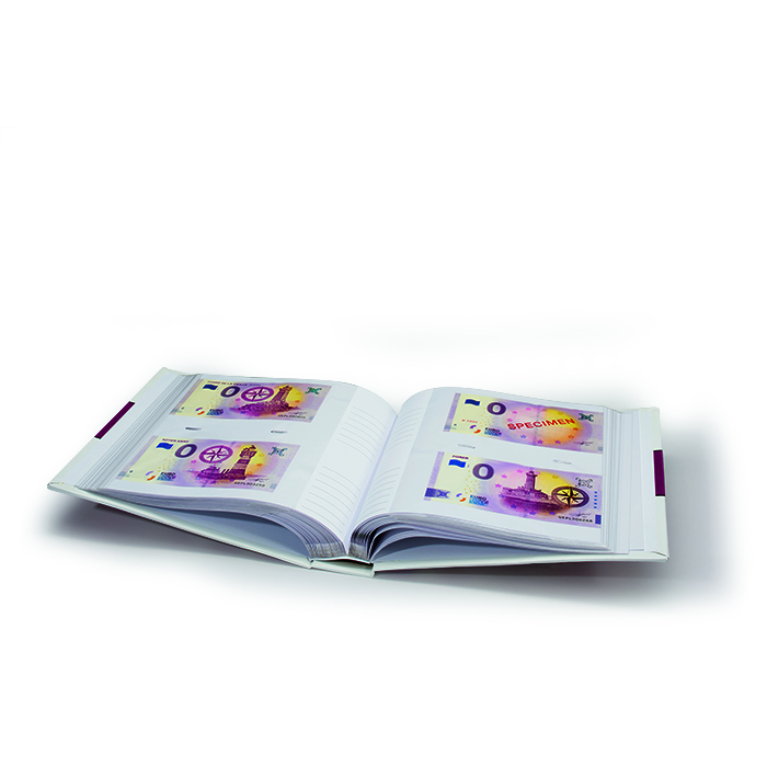 Album for 200 “Euro Souvenir” banknotes for individual collecting. Album with 50 bound sheets for 4 banknotes per sheet. The transparent pockets are bound with the sheets. With lines next to each pocket for individual lettering. Colorful, laminated cover with various motifs of international banknotes. Incl. specimen of a “Euro Souvenir” banknote in limited edition.