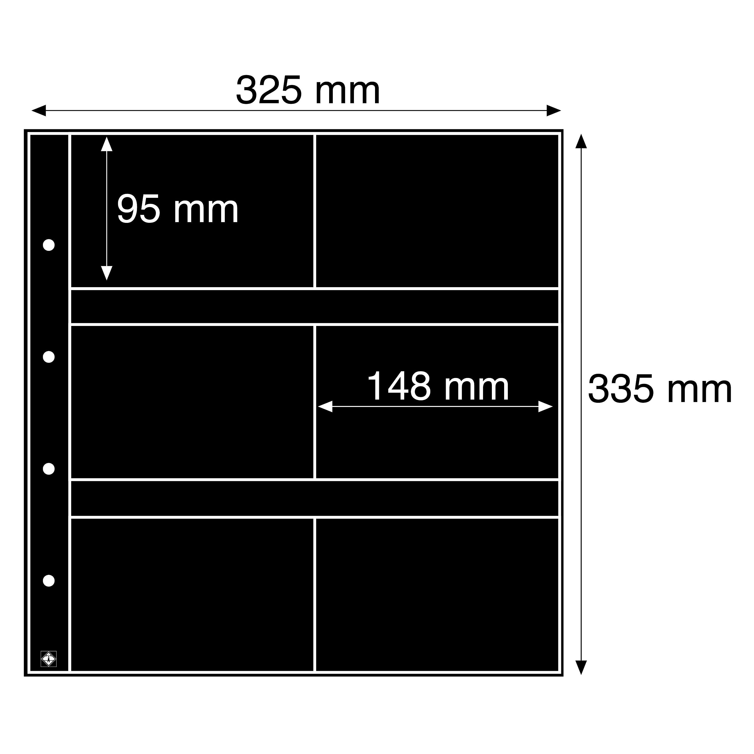 Plastic pocket made of special film, free from chemical softeners. For old postcards, in landscape format. Pocket size (H/W): 325 x 335 mm, compartment size h/w: 95 x 145 mm. Black.