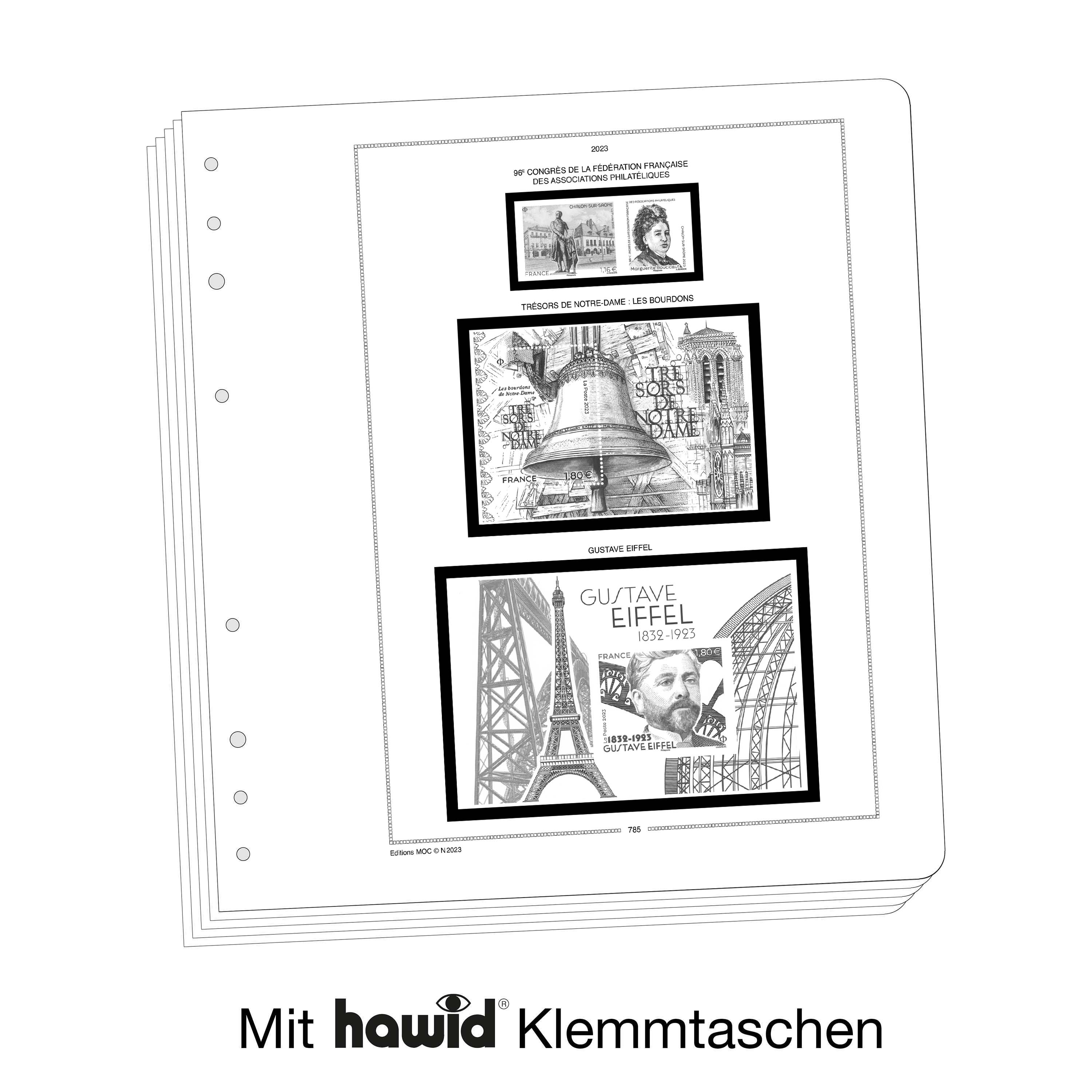 MOC album pages (format 240 x 280 mm/ 8 hole system) are printed in traditional black-white offset printing on age resistant, wood and acid-free card (170 g/m² ). Colour printing is consciously avoided. This allows you to immediately spot the missing stamps. The album pages are made from clear, anti-glare polystyrene film, they are free from chemical softener and are glued to the card of the albums. The protective corners hold the stamps precisely in place which prevents them from sticking. At the same time, they protect the stamps from dust and damage.