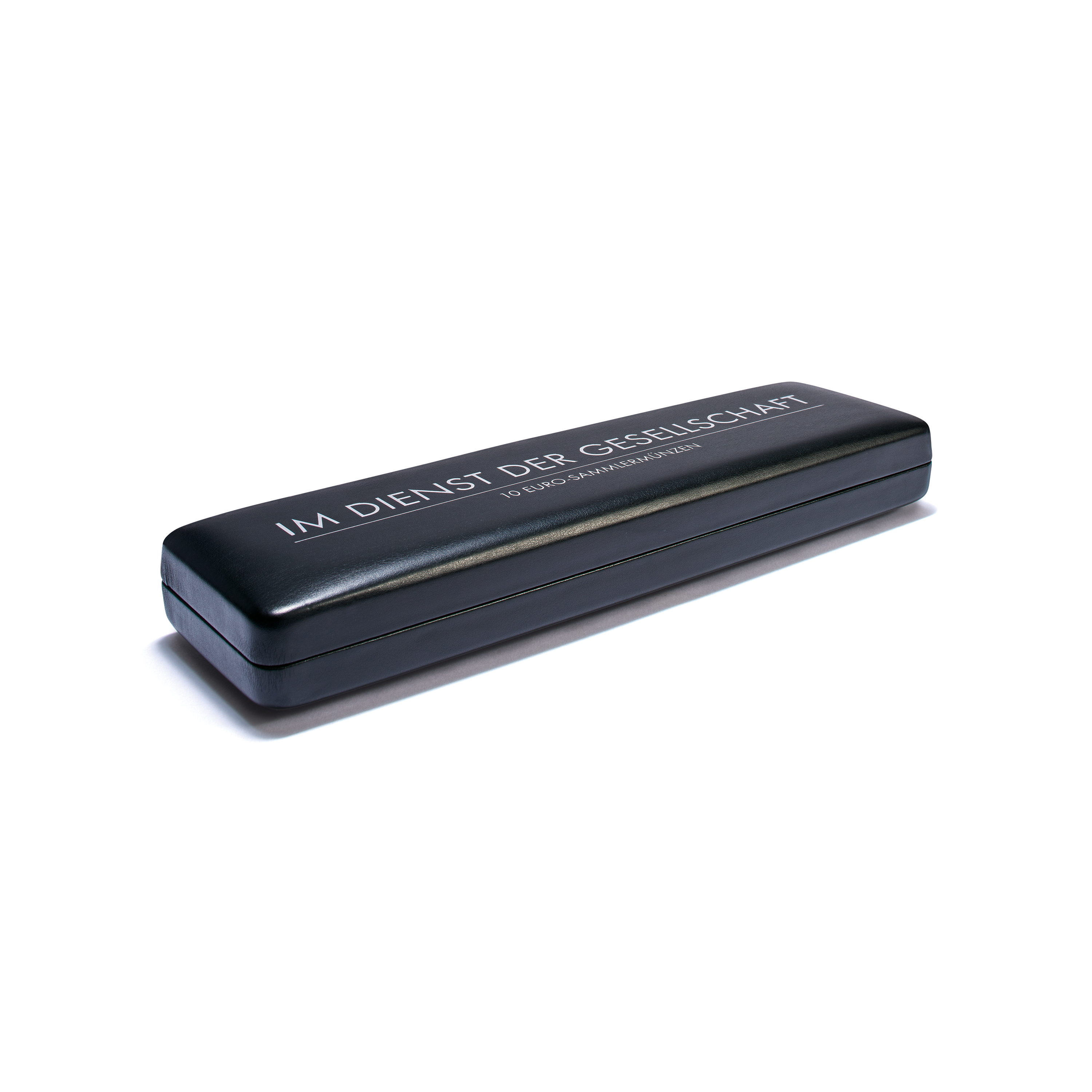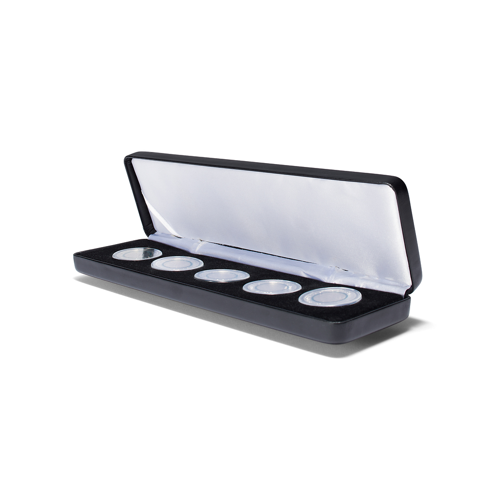 collector coins (2022-2026) of the „In Service to Society“ series in ULTRA Perfect Fit capsules (inner Ø 29 mm). Sturdy metal housing padded and wrapped in finely structured black synthetic leather. One inlay with black, velour-like surface and five round cavities (Ø 35 mm). Lid cushion upholstered in white satin. Including white satin band to hold a certificate. Noble, silver coloured lid print. Outer size: 235 x 65 x 25 mm. Capsules not included.