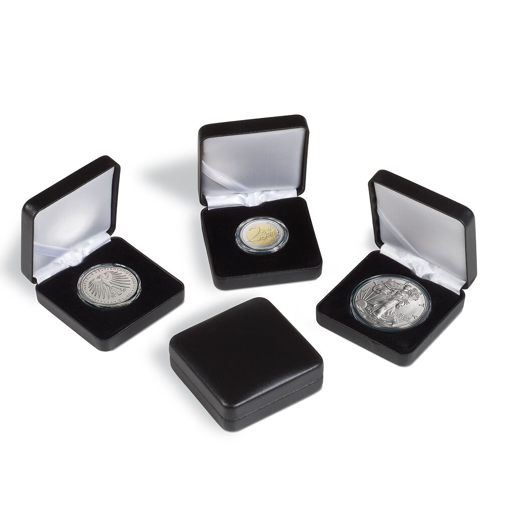Elegant coin etuis with a leatherette finish for storing coins in capsules. The sturdy metal casing is covered with a fine-grained, padded leatherette fabric. The satin-covered lid cushion, as well as the stylish velvet inlay give these etuis a look of premium quality. The inside lid features a satin ribbon to store a certificate.
