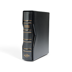 The Numis Pressed Pennies album is ideal for elegant and attractive storage of pressed pennies. The leather-look cover in classic design impresses with its elaborate, high-quality bookbinding workmanship and timeless look. Equipped with a sturdy 4-ring mechanism, this album can hold up to 15 Numis sleeves. The scope of delivery includes 5 Numis sleeves 34 - suitable for pressed pennies in both portrait and landscape format - as well as five white interleaves. The custom-fit protective slipcase provides reliable protection against dust and light. Outer Size: 235 × 240 × 60 mm.