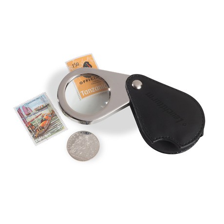 Precision magnifier with 20X magnification. High-resolution detail even for minute details (professional quality). 3-lens system with a diameter of 18 mm. Achromatic and aplanatic lens. Fold-away. Chrome-plated case. Overall size: 20 x 20 x 32 mm ( 3 / 4 x 3 / 4 x 1 1 / 4 "). Leather etui.