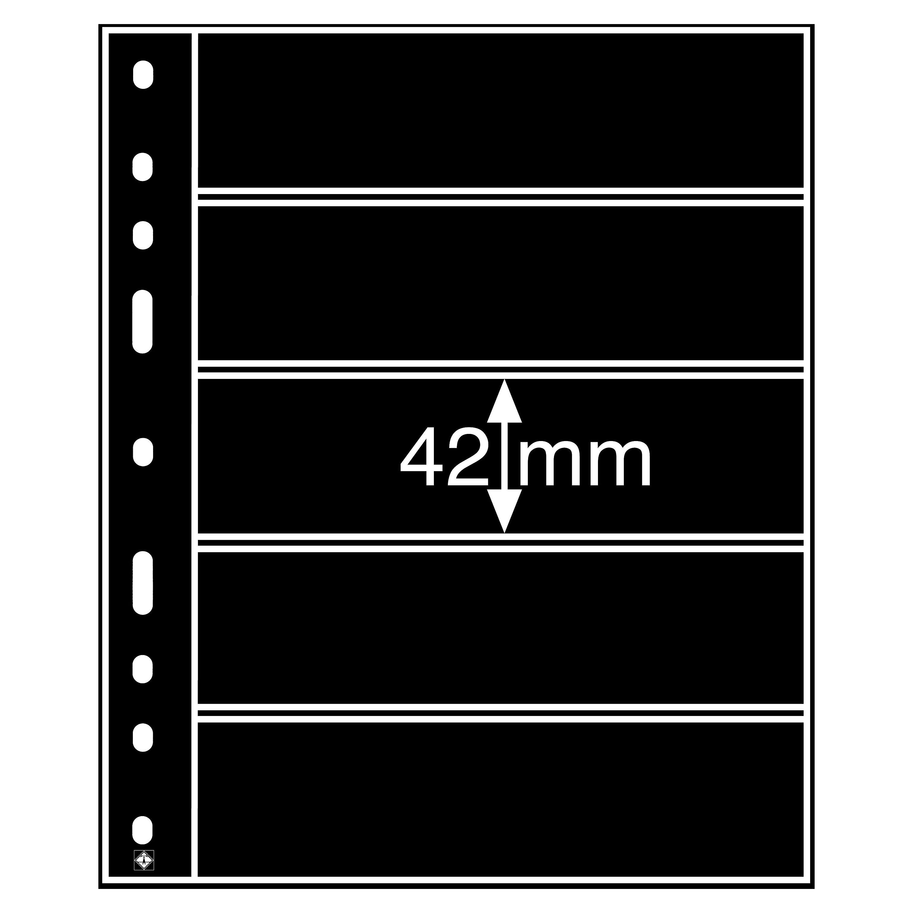Item number: 333229The OPTIMA sheets are made of a special film free of chemical softeners, 5-way division. Ideally-suited for stamps. Sheet size. 180 x 42 mm. Overall size: 202 x 252 mm. Colour: black