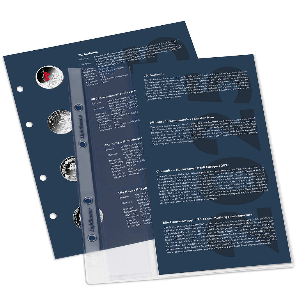 Our pre-printed pages offer detailed illustrations and information on the respective year and are specially tailored to the needs of coin collectors. Each set contains a coin page in 250 x 200mm format. The printed pages contain illustrations and information about each coin. There is also an additional page with detailed background information on the issues. All background information is written in German.