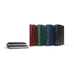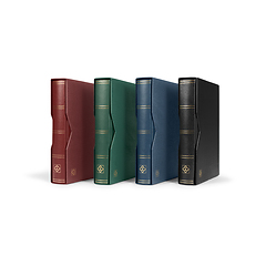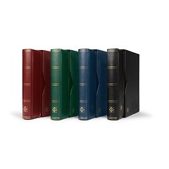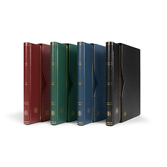 PREMIUM stockbook with 9 clear strips per page and special film free from chemical softeners. Doubled interleaves and double hinge binding, Regenerated leather (85% of natural leather). Available with 32 or 64 pages, with slipcase or without slipcase.