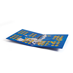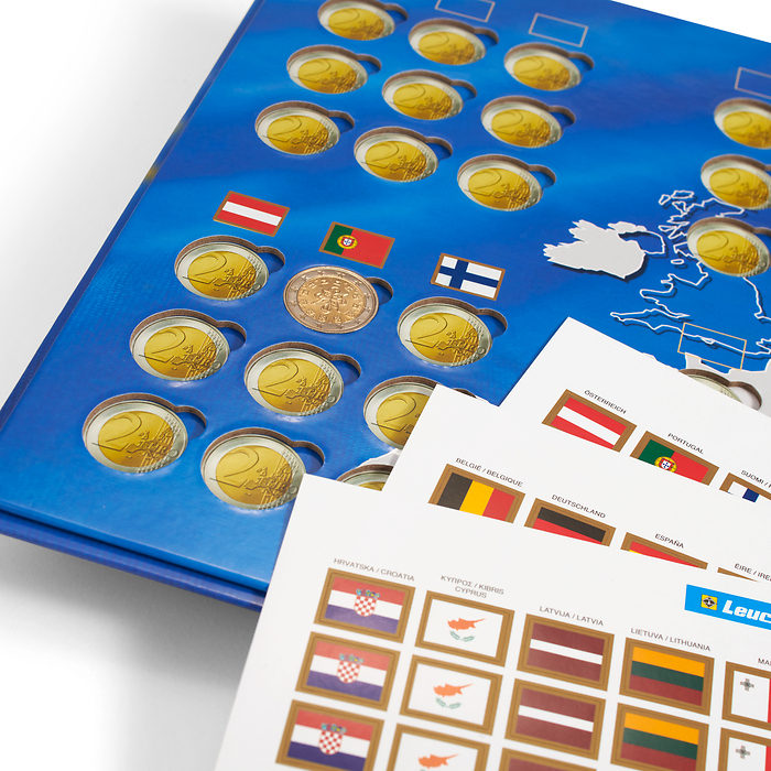 Coin album euro collection made from high-quality, printed strong card featuring cut-outs for 57 2-euro coins, incl. flag stickers for all euro-zone countries for individual identification of 2-euro coins.
