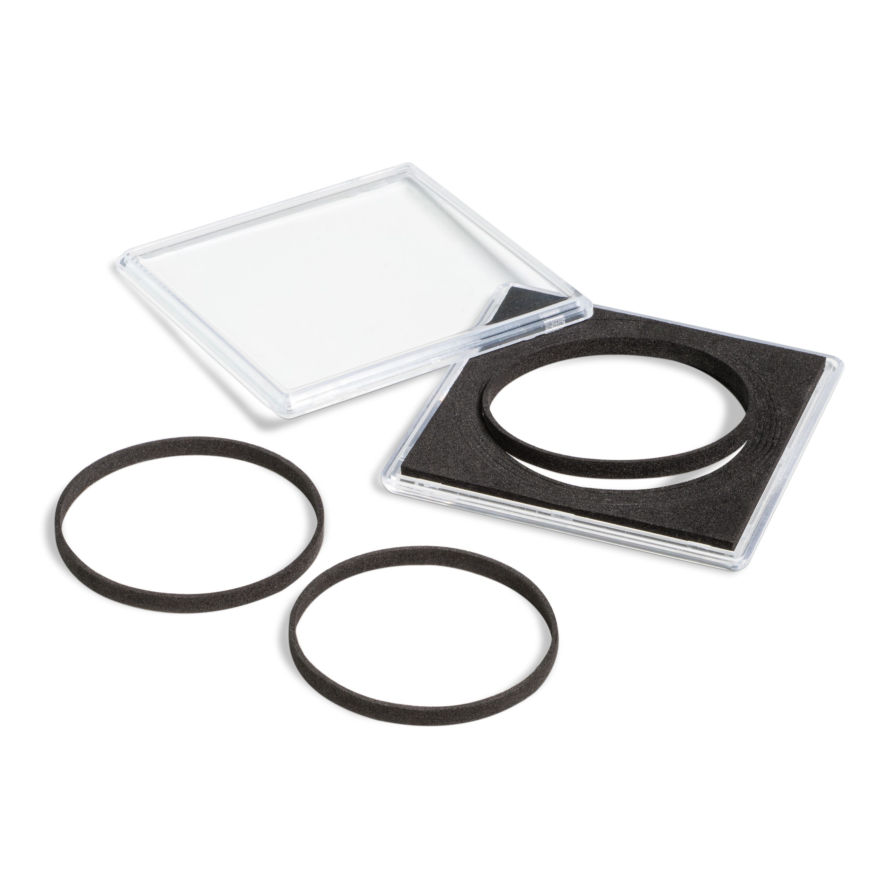 Coin capsules for storing different extra-large coins / medals in one system. With 8 individually removable spacer rings for the fitment of coins / medals with a diameter of 42 up to 58 mm (1 ? – 2 ¼") and a maximum height of 4,5 mm (3/16"). Rings made of black foam (acid and softener free). Overall size: 67.25 x 67.25 x 7.8 mm (2 ? x 2 ? x ¼"). Pack of 5.