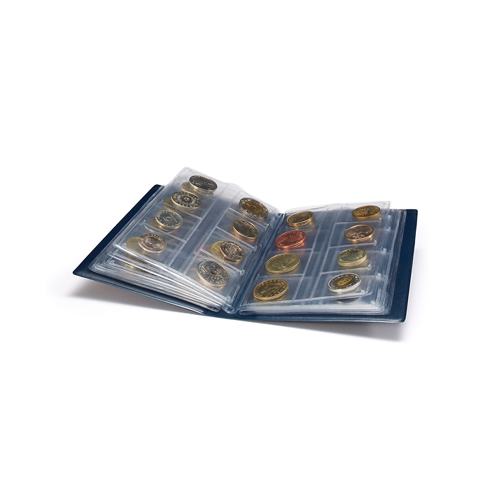 Our pocket album for euro coin sets is a great companion for travelling and exchange days. It contains 12 coin pages, each with space for one euro coin set with 8 coins. The padded cover is decorated with a cover embossing. The outer format measures 120 x 165 mm and the album is an attractive dark blue colour.