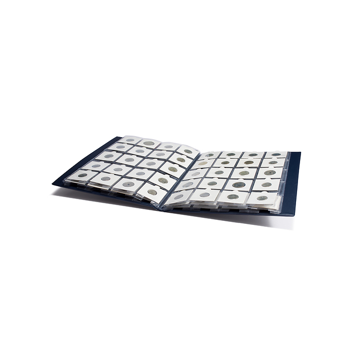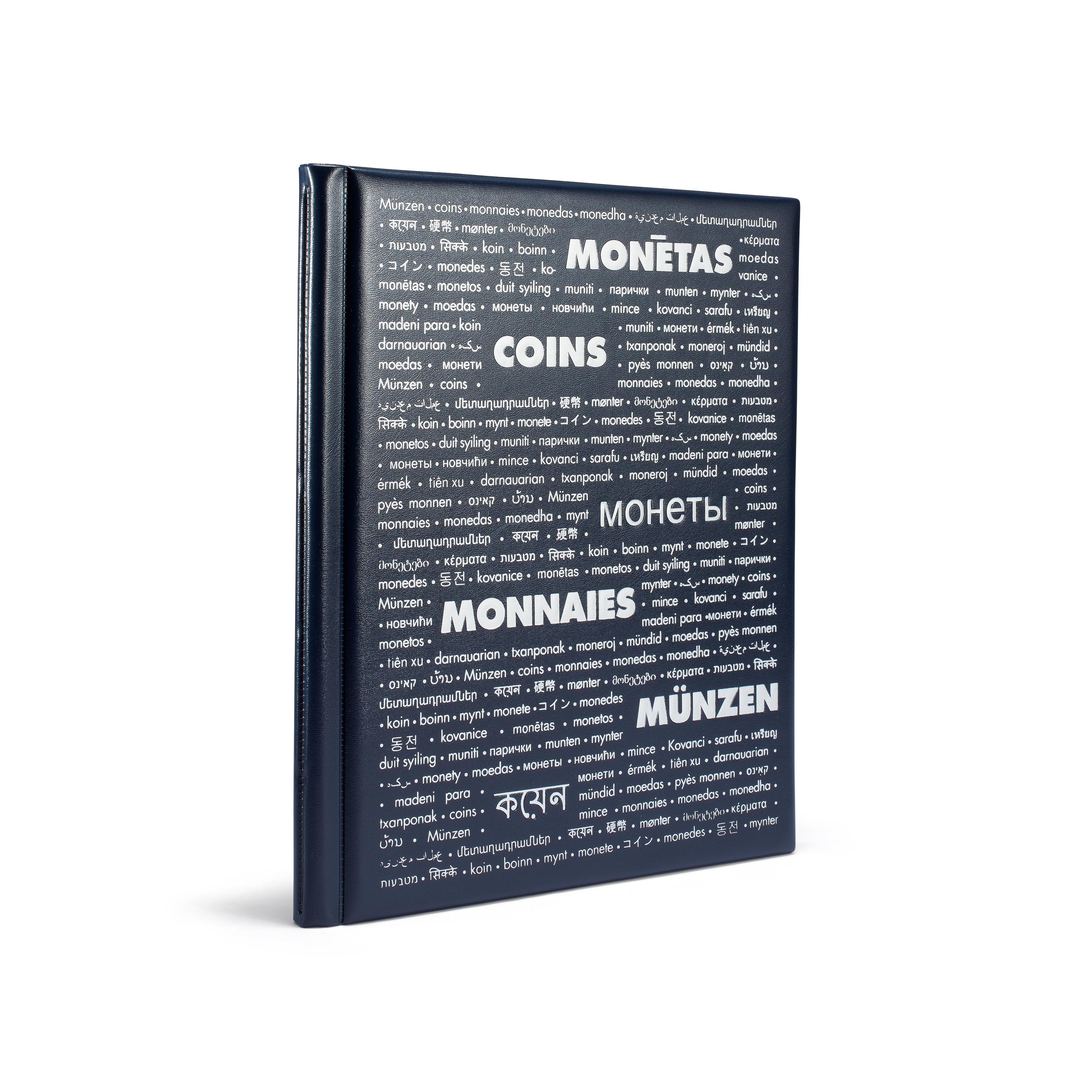 Dark blue album for storing 200 coin holders. Features 10 sturdy, integrated sheets for 20 coin holders per sheet. Padded cover with silver-coloured embossing. Overall size: 245 x 307 x 40 mm (9 5/8 x 12 1/8 x 1 5/8")