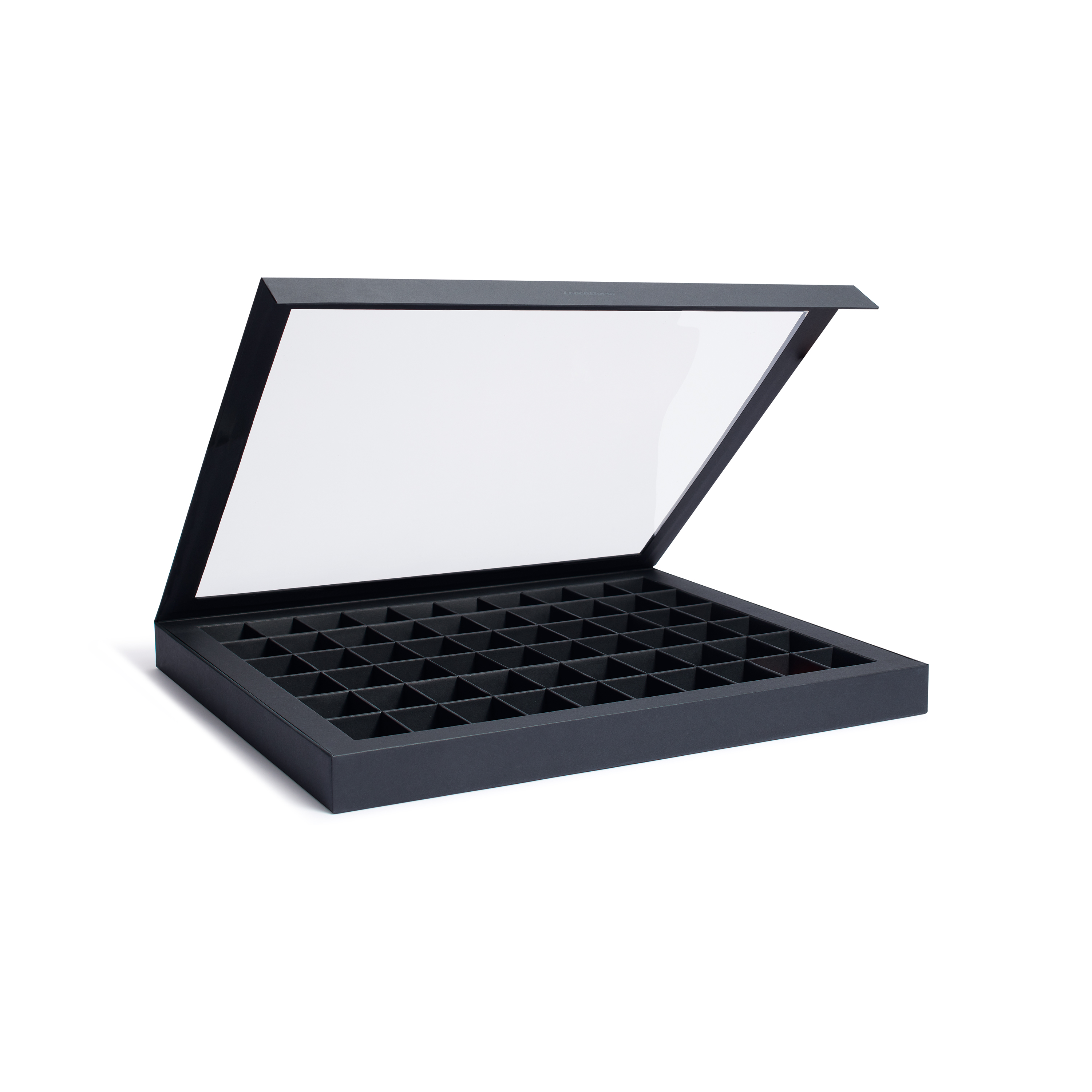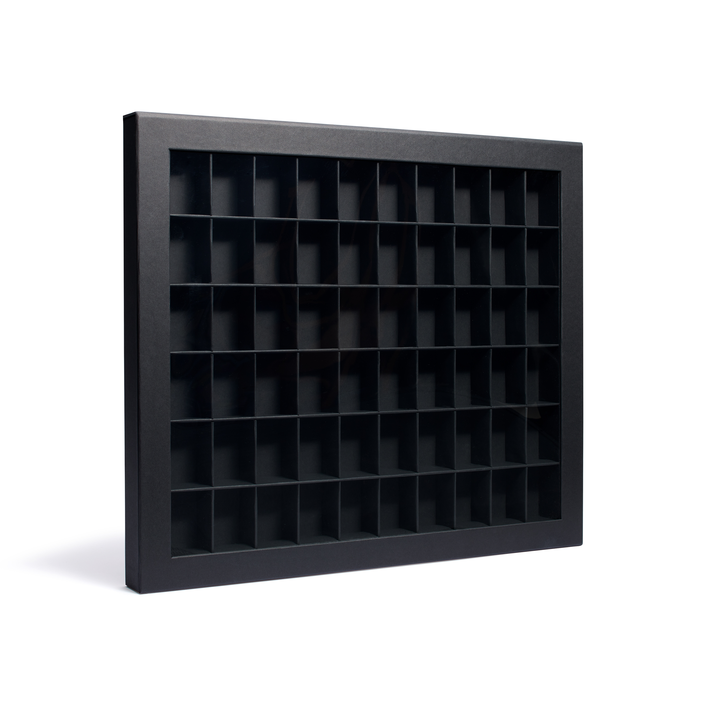 The box in a minimalist design is made of robust cardboard in matt black with firmly integrated dividers. 60 compartments measuring 50 x 36 x 33 mm offer plenty of space. Thanks to the design, all collector's items are visible even when the box is closed. The lid can be opened, has a large viewing window and closes with an inconspicuous magnetic catch - so the collection is well protected and attractively presented at the same time. The box can be hung both horizontally and vertically using eyelets on the back (mounting material is not included). External dimensions: 445 x 384 x 38 mm.