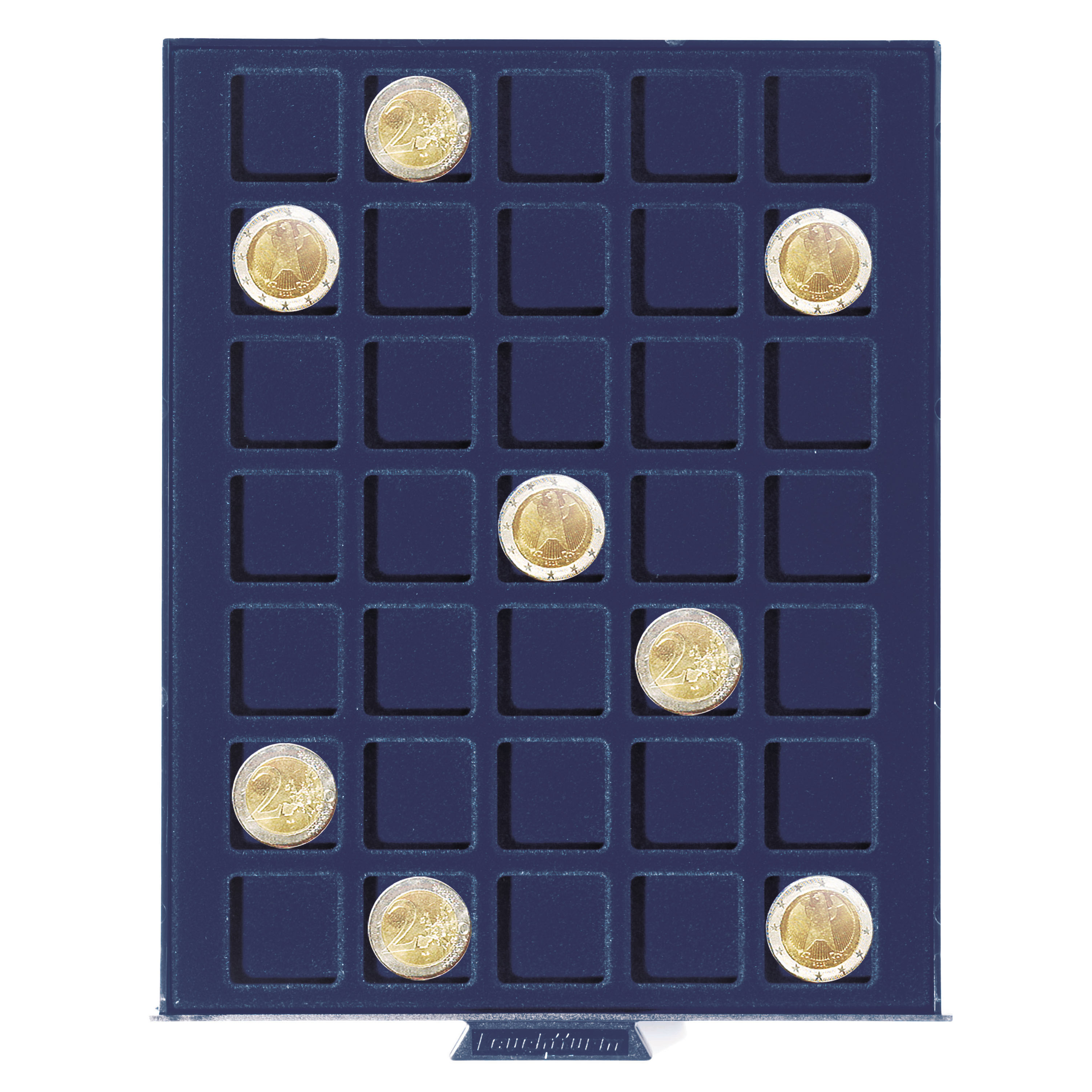 Clear stacking frame with dark blue tray, velvet-blue insert, suitable for safe deposit boxes. This tray is equipped with 35 square compartments and is ideal for storing coins up to a diameter of 27 mm. Overall size (h/w/d): 19 x 195 x 250 mm.