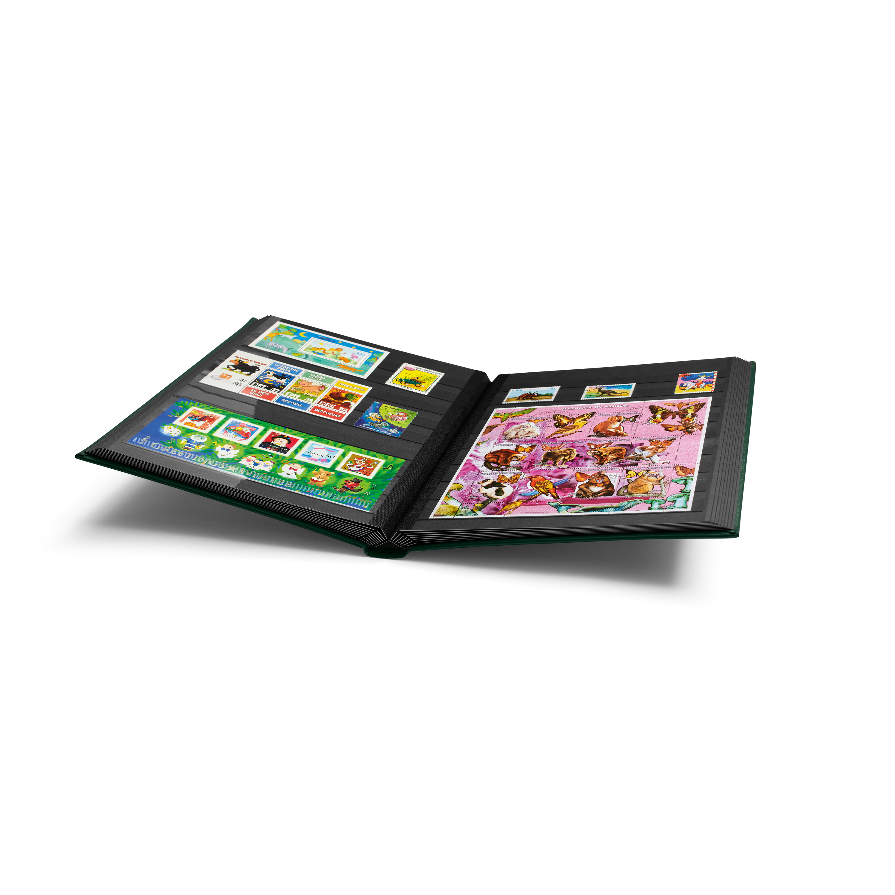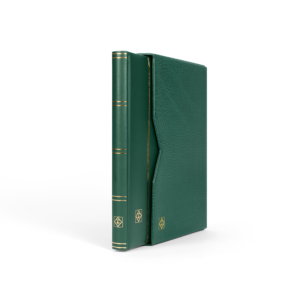 Stockbook Premium, A4, 32 black pages, padded leather* cover incl. slipcase, green