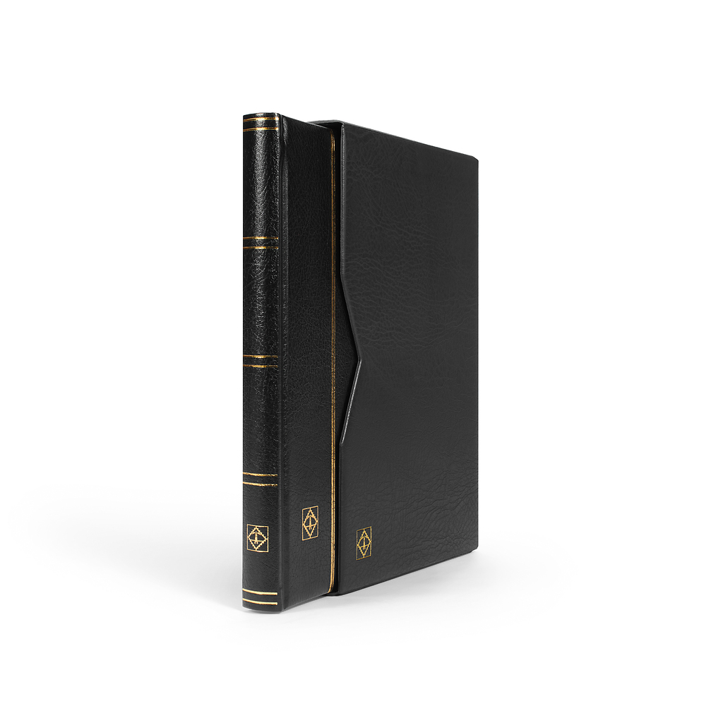 Stockbook Premium, A4, 32 black pages, padded leather* incl. slipcase, black