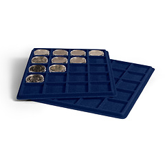 Drawers with blue, mock velour surface for storing coins. Encapsulated coins or bare coins can easily be inserted into the square fields. In packs of 2.