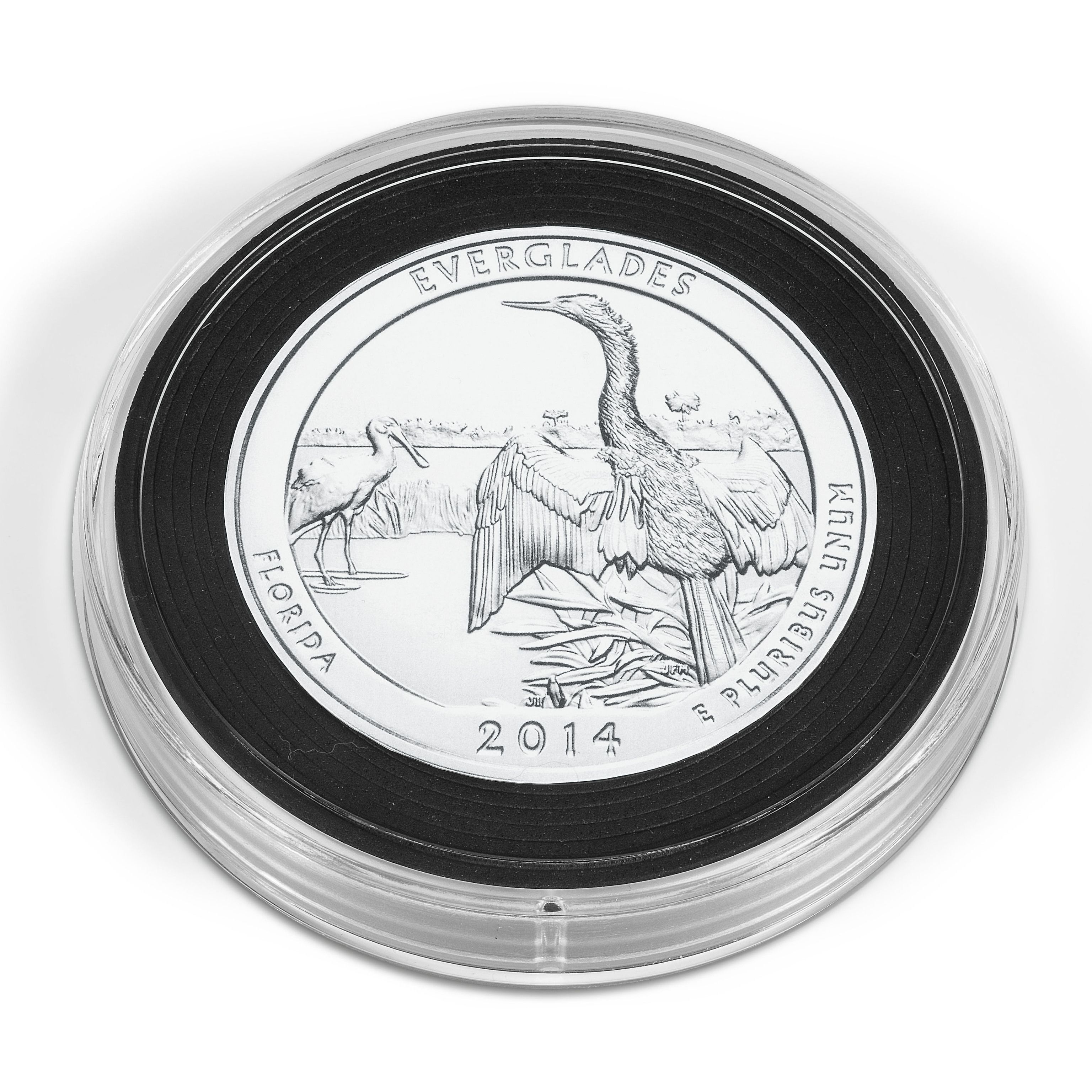 The XL coin capsule is ideal for storing particularly large coins of up to 101 mm in diameter – for example, 1 kg coins. They contain 12 individually removable spacing rings made from black foam (free from acid and chemical softeners), also allowing smaller coins of up to 53 mm in diameter to fit perfectly in the capsule. The inside height of the capsule is 14.63 mm, while the exterior height is 20.4 mm. Exterior diameter: 111.4 mm.