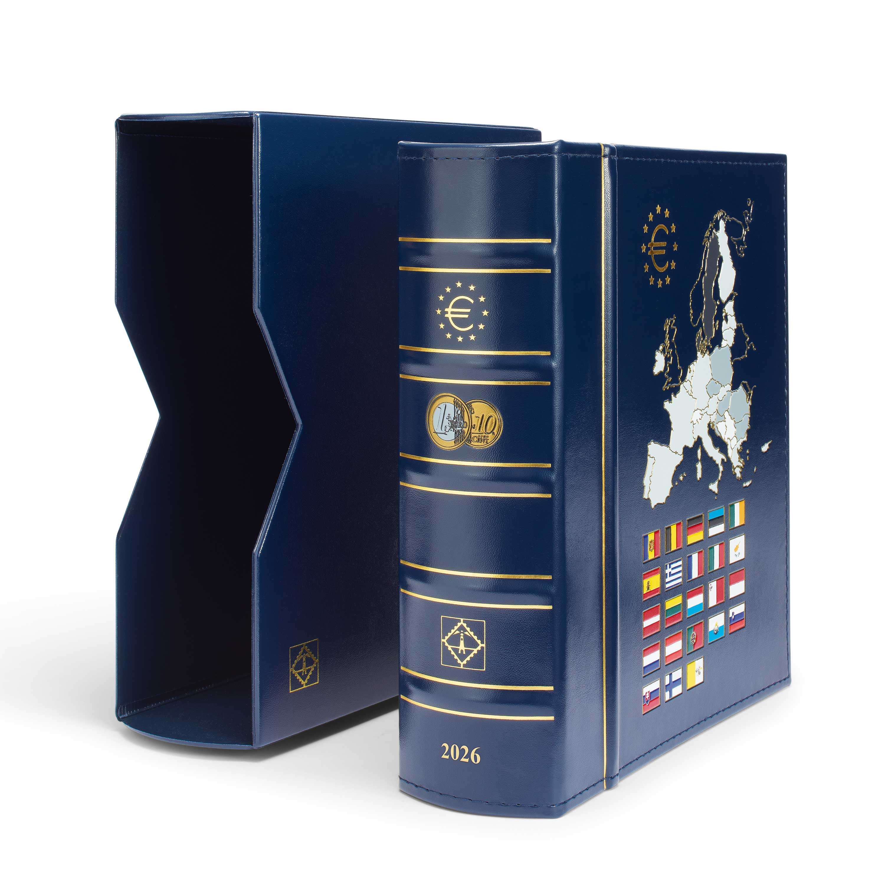 Our Vista coin album is the perfect solution for collecting the 2026 Euro coin sets. The Vista coin pages are made of sturdy cardboard with rigid PVC insertion windows, allowing you to store 2 euro coin sets per page. The leatherette cover gives the album a sophisticated look and features detailed embossing on the spine and cover. The coin pages are designed with coloured flags, which guarantees a high-quality look. We offer annual volumes to expand the series. Small states such as Monaco, San Marino, Andorra and the Vatican are not included in this album.