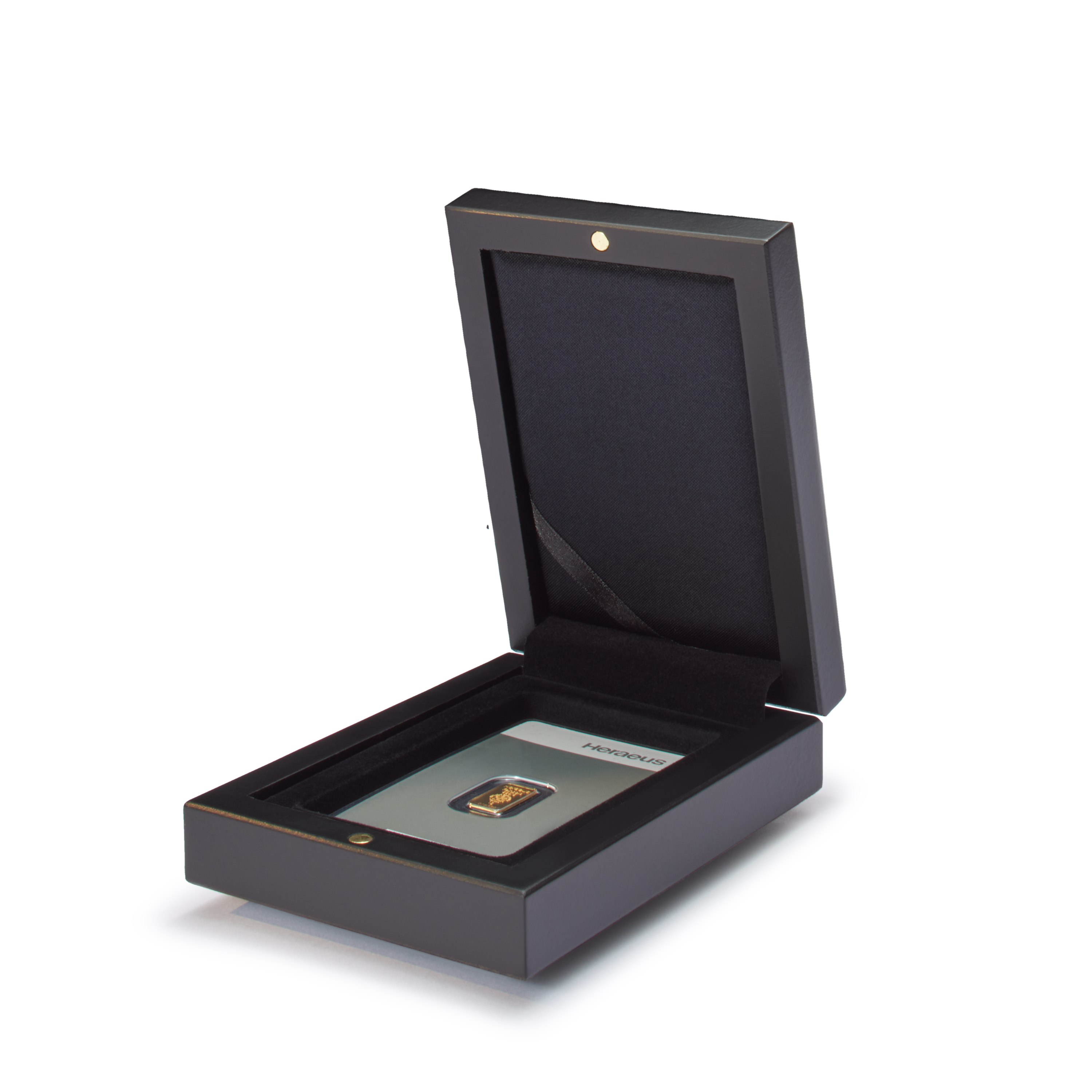 Elegant case with a black wood grain finish for stylish storage of gold bars in blister cards. The inside of the lid is padded with soft black satin, while the bottom part has a refined, velvety surface. Thanks to an integrated "tilt mechanism," the bars can be easily removed. External dimensions of the case: 120 x 90 x 34 mm, suitable for blister cards sized 86 x 54 mm.