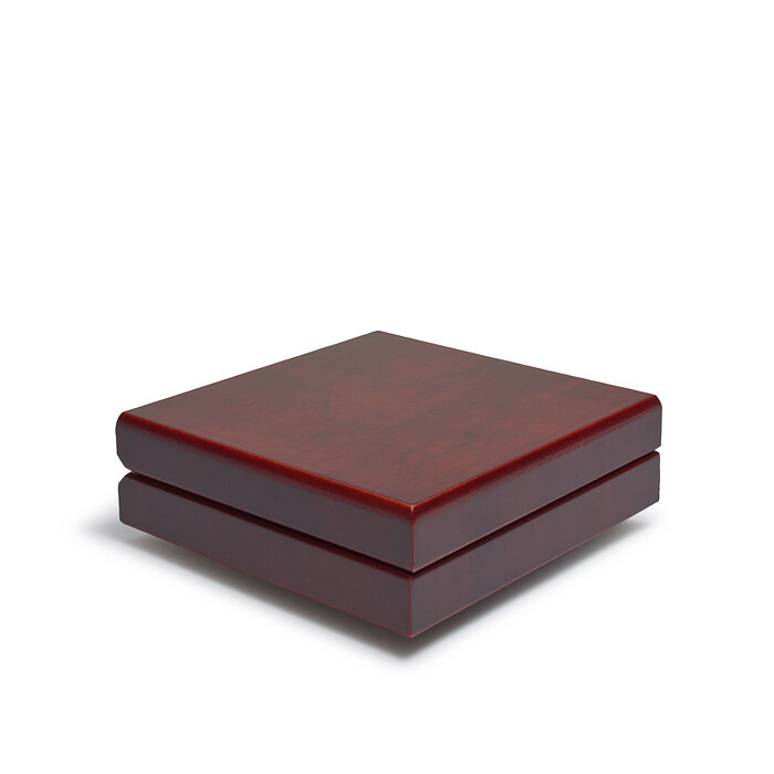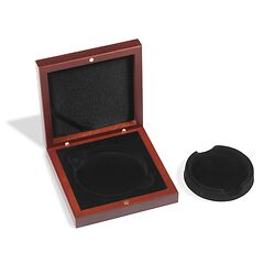 VOLTERRA coin etui with mahogany grain finish for 1 GRIPS XL 21–62 capsule or 1 GRIPS XL 29–76 capsule. Lid cushion upholstered in black satin. Black two-part velour-like inlay with one cavity each (Ø 67.5 mm / 2 5/8" & Ø 82.5 mm / 3 1/4"), removable. Incl. satin band for holding certificates. Overall size: 120 x 120 mm (4 3/4 x 4 3/4").