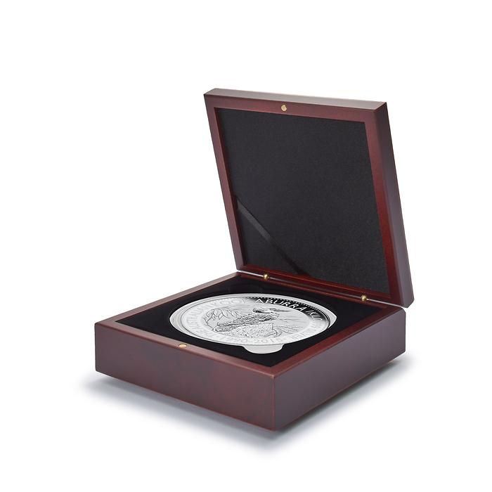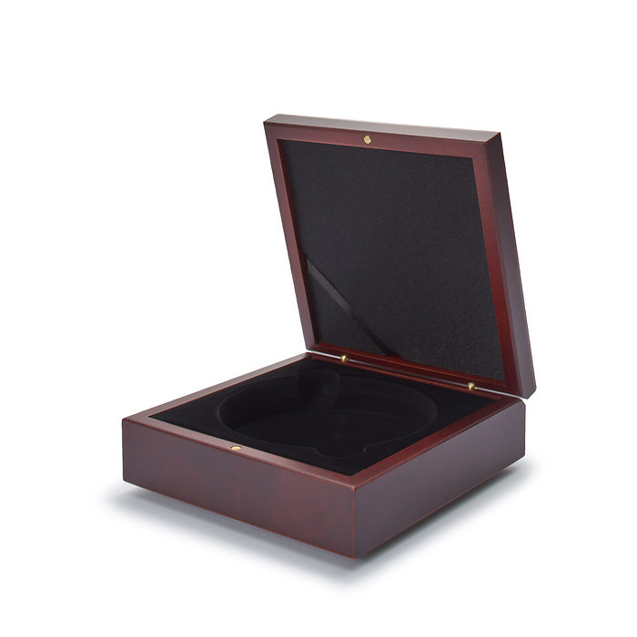 VOLTERRA coin etui with mahogany grain finish for 1 GRIPS XL 53–101 capsule. Lid cushion upholstered in black satin. Black velour-like inlay with one cavity (Ø 111.5 mm / 4 3/8"). Incl. satin band for holding certificates. Overall size: 150 x 150 mm (5 7/8 x 5 7/8").